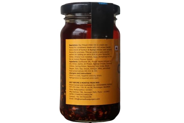 Our Prawn Chilli Oil is a bold and flavourful condiment made with rich prawn heads and a blend of Guntur & Byadgi chillies with several flavourful aromats. This jar packs a spicy punch perfect for adding an extra kick to your favourite dishes. Drizzle it on noodles eggs dumplings or rice for an instant flavour boost. 200 grams
