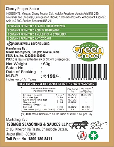 VinegarCherry PepperGarlic Powder SaltAcidity Regulator Acetic Acid (INS 260) Emulsifier and Carrageenan (INS 407) Xanthan (INS 415) Antioxident Ascorbic Acid (INS 300) Sodium Benzoate (INS 211) and Spice & Con Diments Extract.