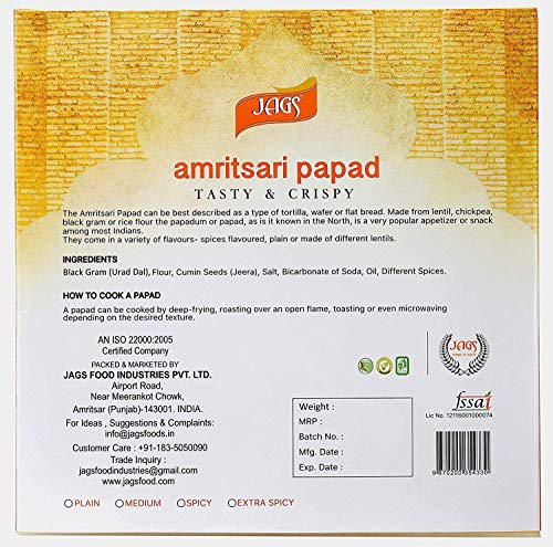 JAGS Amritsari Papad can be best described as a type of tortilla wafer or flatbread. Made from lentil chickpea black gram garlic or rice flour the papadum or papad as it is known in the North is a very popular appetizer or snack among most Indians.