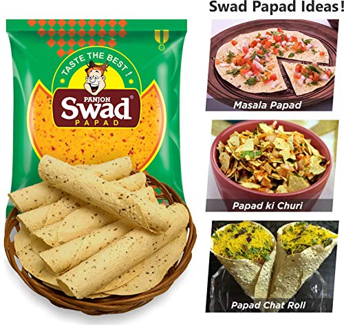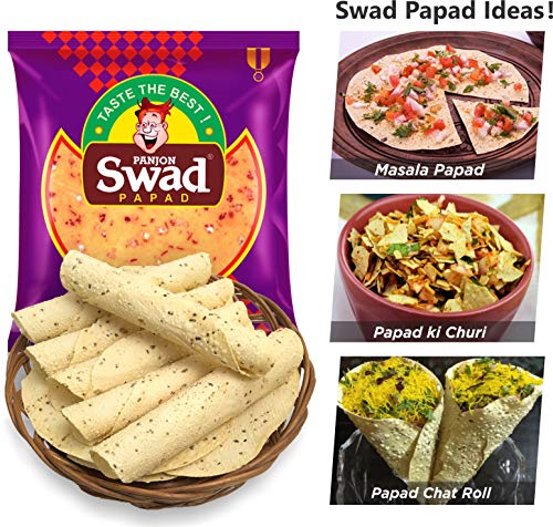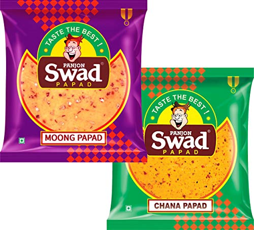 Swad Papad Chana & Moong Papad 2 Packs (Medium Spicy Punjabi & Rajasthani Taste 100% Cripsy | Fried or Roasted) Chana & Moong Dal Papad Snack 2 Packs x 400g. Hygienically made with Quality Kitchen ingredients: Dal gram flour Salt Spices Asafoetida Hing Mirch Edible Oil etc. Authentic Traditional Taste curated by Home Chefs - Mothers. Helps in Digestion & Gut health. Prepares within 1 minutes Masala Papad Roll. 100% Vegetarian. 100% Tasty & Digestive. Quality from Swad - Panjon Limited. Best served with chutney pickle Khakra Chai Tea as a Crispy & Crunchy Snack. Swad Papads can be cooked in many ways! Ideal Snack for House Party Weddings Birthday Menu Anniversary Gift Ready to Eat. Also try all 5 flavours of Swad Papads - Swad Urad Papad Spicy Urad Papad Chana Papad Moong Papad & Kali Mirch Papad.