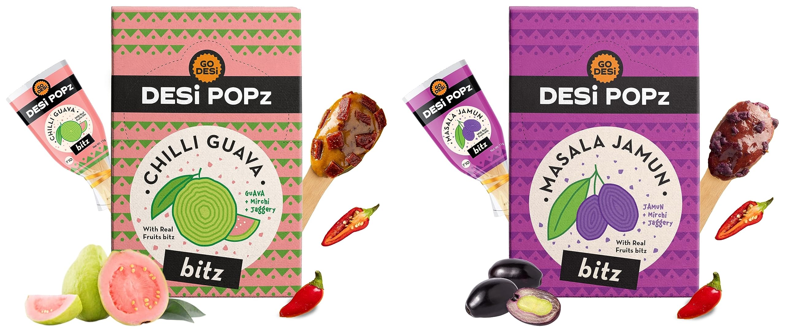 GO DESi POPz with Bitz | Chilli Guava | 50 Pcs | Fruit Snacks 400 gmYour favourite DESi lollipops just got bigger and better with the new DESi POPz with Bits- Chilli Guava: A spicy-sweet lollipop featuring a classic DESi combo- Ripe pink guavas and Chilli. What's more every bite hides a special surprise- real guava pieces!!!GO DESi POPz with Bitz | Masala Jamun | 50 Pcs | Fruit Snacks | Java Plum | 400 gmYour favourite DESi lollipops just got bigger and better with the new DESi POPz with Bits- Masala Jamun: A mouthwatering chatpata treat featuring the goodness of fresh Jamuns jaggery DESi masala and some extra love. Now with real jamun fruit bits for some extra DESi indulgence!