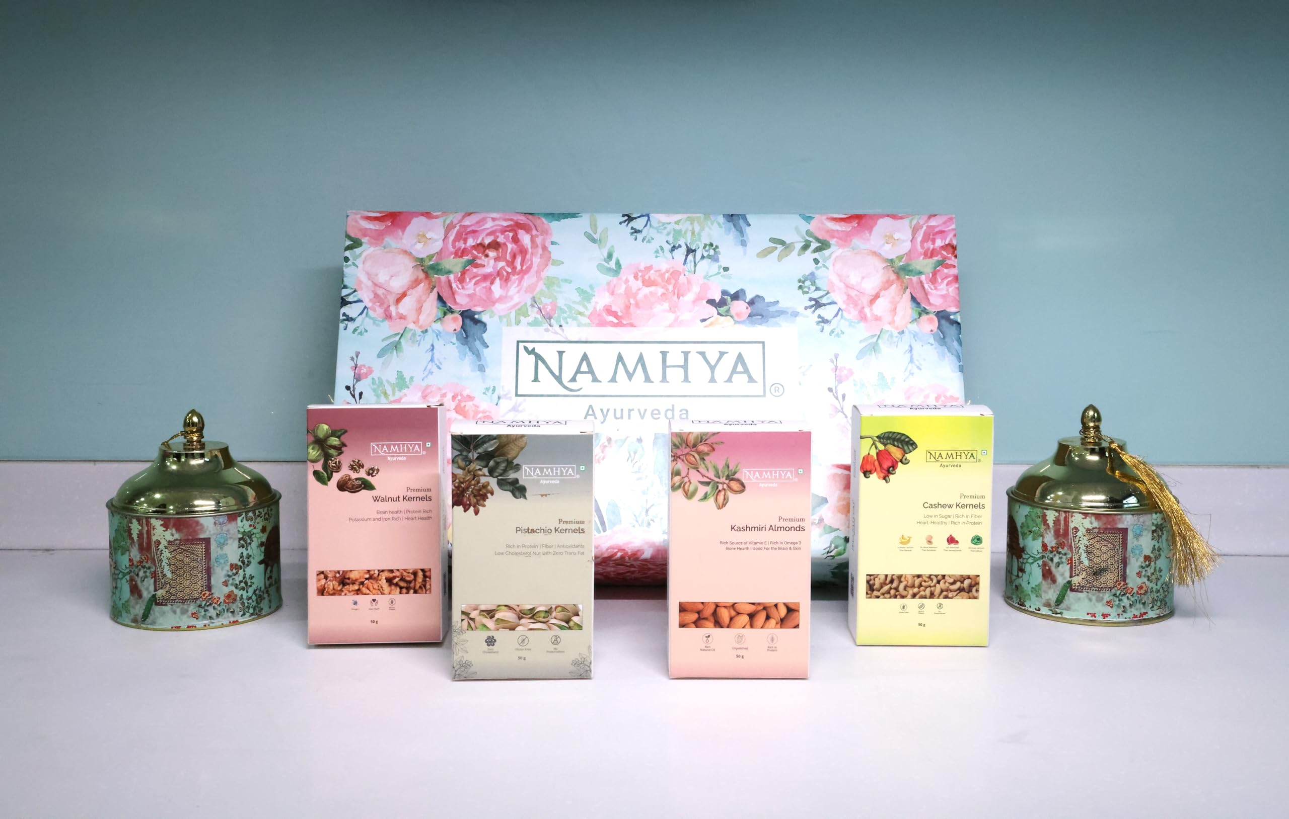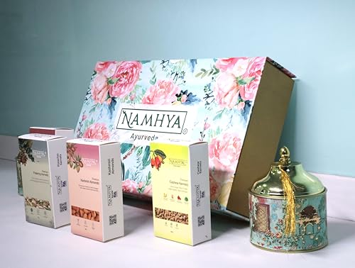 Namhya Diwali Signature Delights Gift Box Premium is a classic assortment of 4 variety dry fruits packs crafted with love and care in a beautiful floral gift box. This set includes-Namhya Kashmiri Walnut Kernels 50g x 1 Premium California Pistachios 50g x 1 Premium Kashmiri Almond Kernels 50g x 1 Cashew Kernels 50g x 1 Premium Gift Box x 1