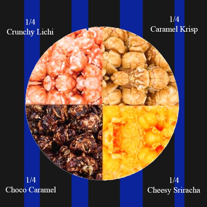 4 Flavors - Caramel Krisp Popcorn Choco Caramel Popcorn Crunchy Lichi Popcorn Cheesy Sriracha Popcorn