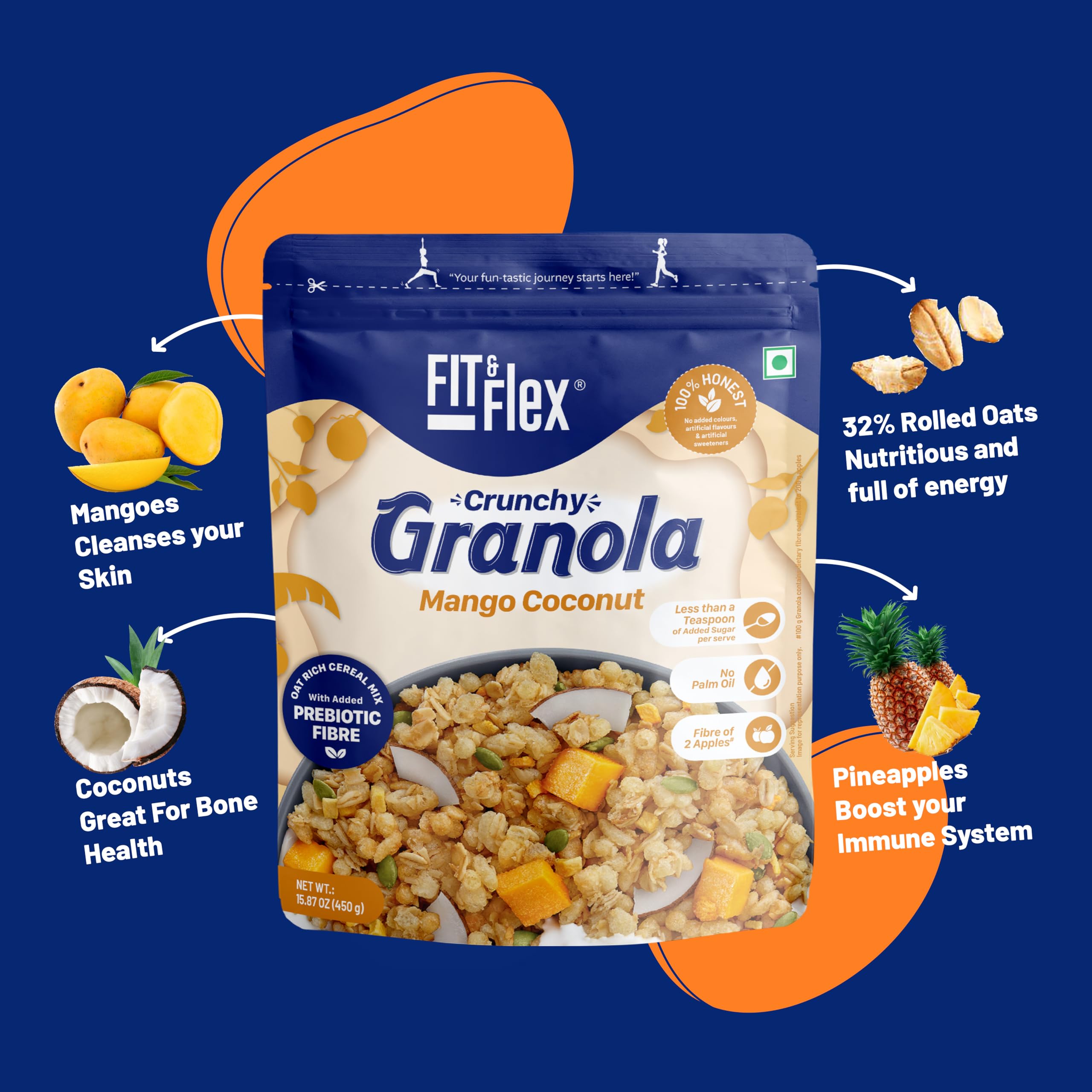 FIT & FLEX Baked Crunchy Mango Coconut Granola (450 g) And Choco Almond Cookie Muesli (450 g) - As Seen on Shark Tank India - 900 g (Breakfast Combo Pack of 2)