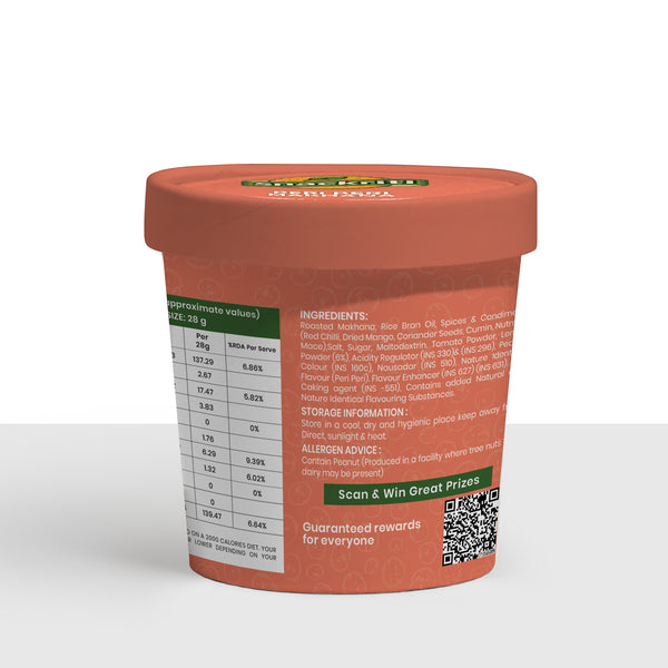 Turn up the heat with Peri Peri Makhana bold, spicy, and utterly addictive. Roasted fox nuts tossed in tangy and fiery peri peri seasoning deliver a global flavor with Indian nutrition.