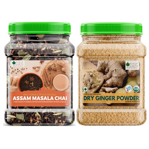 Bliss of Earth Masala CTC Tea (Chai) with Herbs & Spices is a healthy blend of Assam CTC Tea Leaf Assam Black Orthodox Tea and Twenty Herbs and Spices that produce a unique taste to traditional Milk Tea and also reduce the gas and acidity which is common with ordinary CTC tea. Our CTC Tea (Chai) is a Blended Herbal Tea made from finest Tea Leaves produces in Upper Assam region and enriched with Orthodox Black Tea Leaves to produce perfect Taste Aroma and Colour. It is blended by Tea Experts with Twenty Herbs and Spices that add a unique taste and herbal benefits making your everyday tea drinking more healthy. Bliss of Earth Ginger Powder is a organic versatile herb known for centuries for its health benefits. The ginger used is completely dehydrated at low temperatures so that it retains all the essential nutrients and the amazing flavor it offers. 115 chemical compounds are known to be found in the ginger root making it a super antioxidant and anti-inflammatory agent. Ginger has been proven to helps in boosting immunity digestive support and cough & cold. We love how fresh ginger makes us feel. Its natural flavor makes a perfect addition to your favourite juice smoothie or tea.