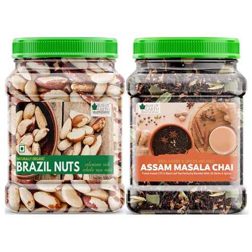 Bliss Of Earth Combo of Healthy Brazil Nuts Selenium Rich Super Nut (500gm) and Finest Assam Masala Chai Blended CTC Leaf Infused with 20 Real Herbs & Spices (400gm) Pack of 2