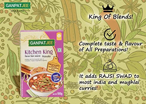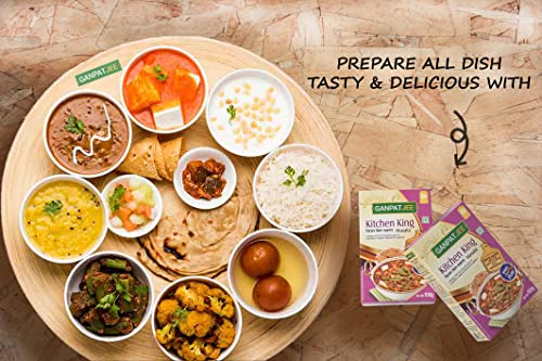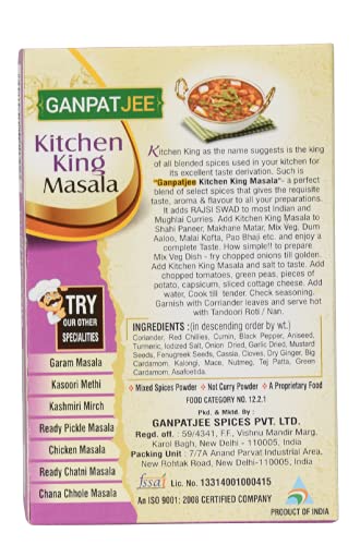 About GanpatjeeGanpatjee believes in superior quality products with the best quality ingredients packed with due care and hygiene.Kitchen King Masala100 gmGanpatjee Amchur Powder is prepared from the best quality dried clean mango flakes give a sweet-sour taste to your dishes. The use of amchur powder in Indian dishes is known from ancient times. Good antiseptic and great for the skin. It can be used in face packs also. It is a souring agent so it can be used to flavour braises stews soups and vegetable dishes. It is a highly versatile spice used in various ways in the culinary world including spicing food and beverages seasoning vegetables. Serve good food for your healthy life. It is sour yet sweet to taste. It will spice up your food but will also add aroma and delicious flavour to your every dish. Amchur powder may improve your digestion and helps to fight acidity. It also helps in weight management. An ideal pick for making delicious food this powder will blend with almost any recipe. It also ensures good bowel movement. This masala comes with various health benefits and is something you should have in your kitchen cabinet. It will turn any vegetables into a tasty treat. Add it to curries and salads to enjoy the tangy taste.Product Specifications:Product: Kitchen King MasalaQuantity: 100 GramIngredients: Coriander Red Chillies Cumin Black Pepper Aniseeds Turmeric Iodized Salt Onion Powder Garlic Powder Mustard Seeds Fenugreek Seeds Cassia Cloves Dry Ginger Big Cardamom Mace Kalong Nutmeg Tej Patta Green Cardamom AsafoetidaProduct FeaturesThey are rich sources of vitamins and mineralsIt is healthy masalaServe it or Sprinkle over Indian meals like Daals Cheela Chutneys etcVegetarian Product! No Artificial colours and No additives