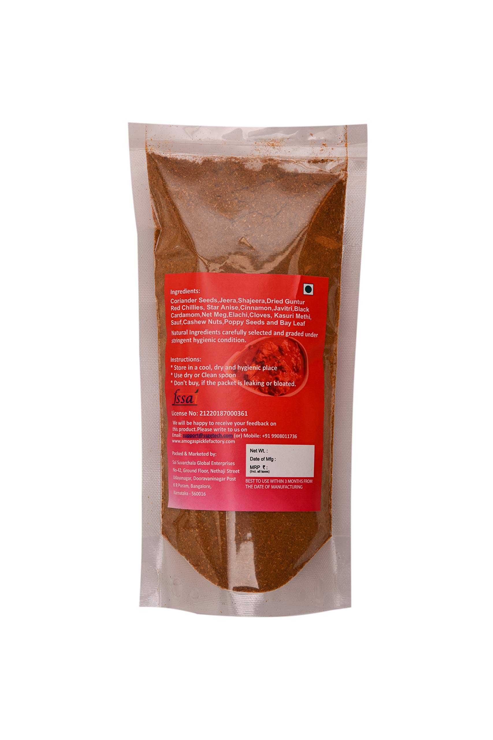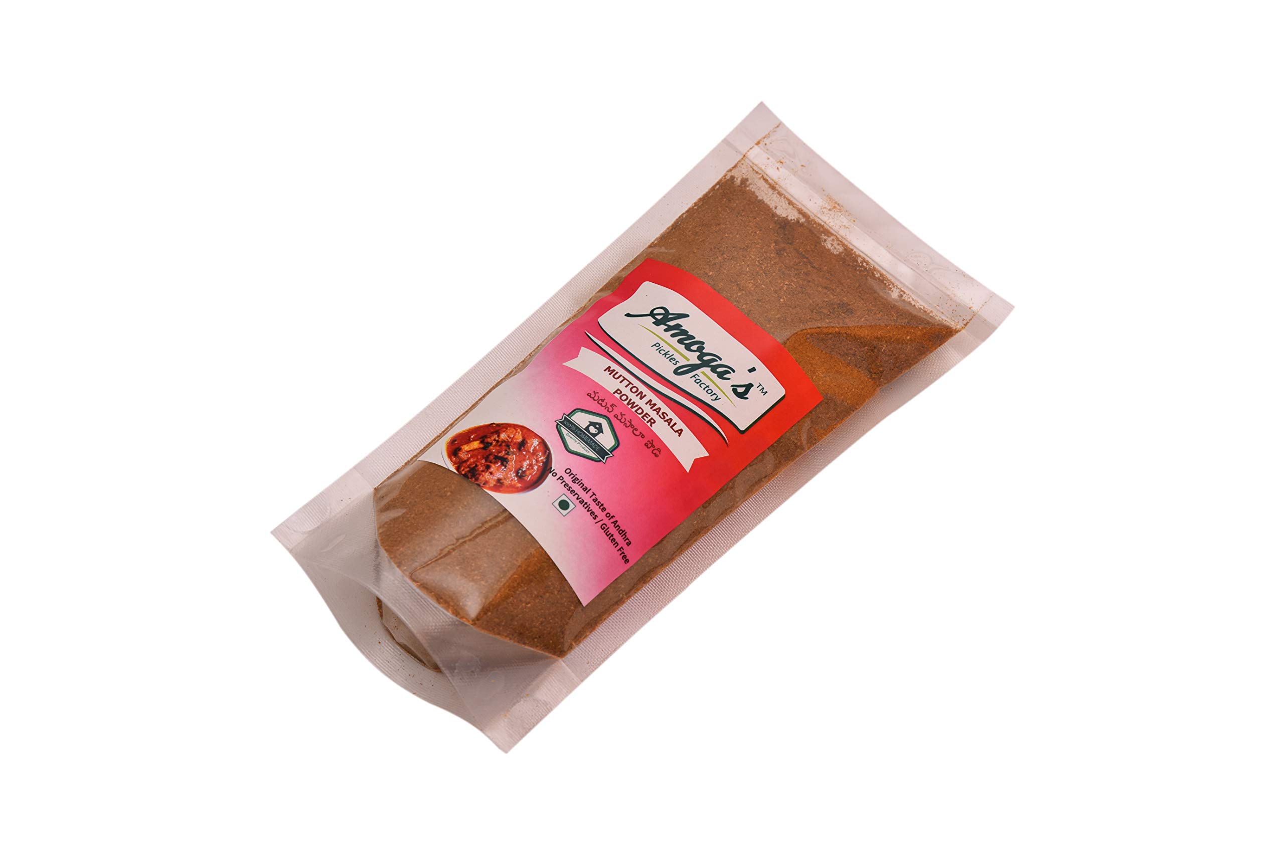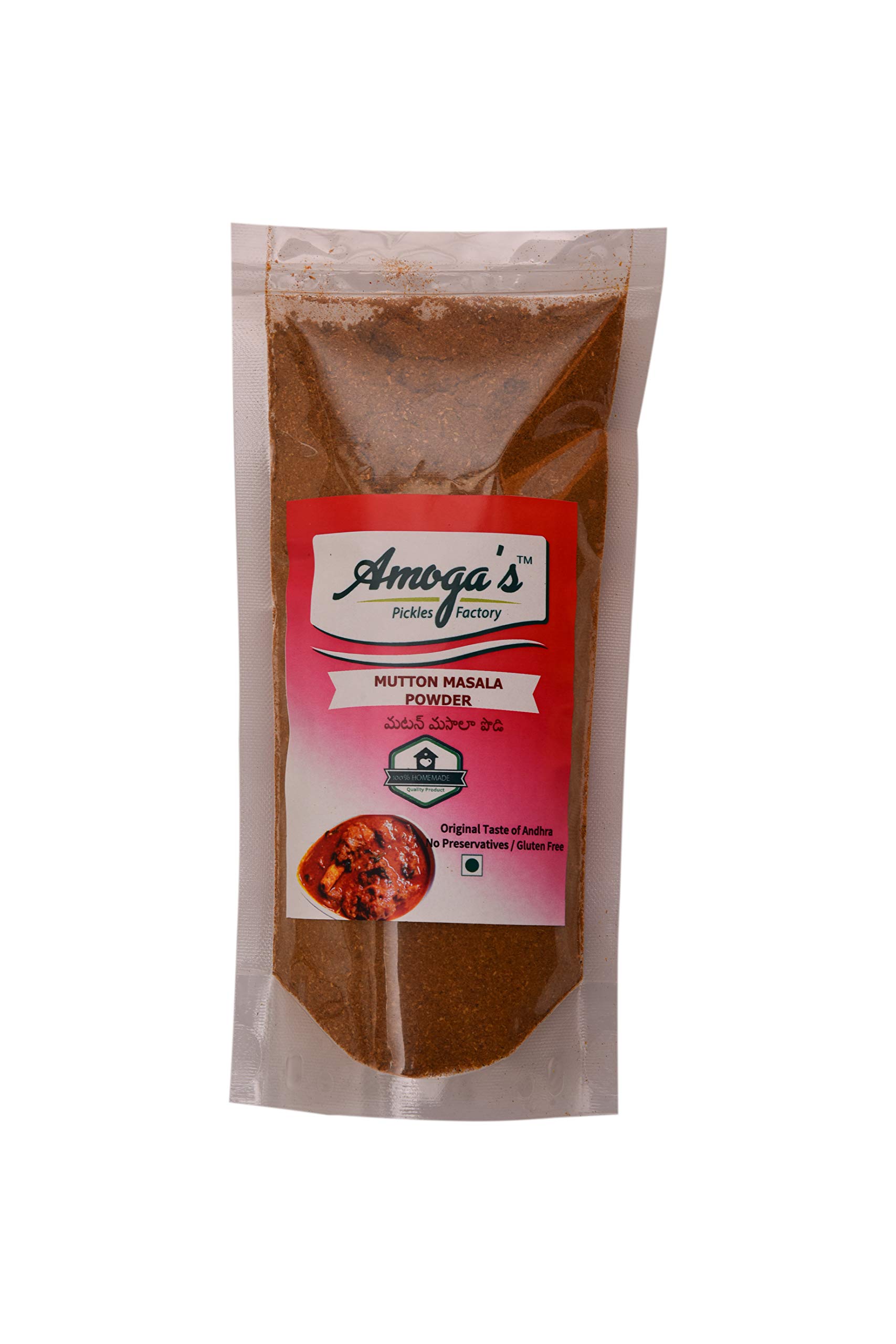 Amoga's Pickles Factory Mutton Masala is a mixture of ground spices used in preparation of indian foods.The taste depends on the Quality we use so we use the best in quality which were grown regionally.Ready made packed Masala's were used by most of the working women This Mutton masala goes well with South Indian and North Indian Mutton Curries.Cleaning & sundrying them and roasting is the important for hygienic reasons.so we follow the same procedure.We have researched a lot and finally made this blends of Mutton Masala.