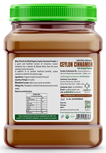 Bliss of Earth Certified Organic Ceylon Cinnamon Powder is a purer and healthier version of cinnamon. Ceylon cinnamon has a sweeter & delicate flavor than the more common Cassia cinnamon.In addition to its positive medicinal benefits ceylon cinnamon is ideal for all culinary usage.Our Ceylon Cinnamon is organically grown harvested and manually processed using traditional methods that have been used for centuries.Ceylon cinnamon known as true cinnamon is the purest form of cinnamon. Most commercial cinnamon is of the Cassia variety which has much less flavor or nutritional benefit since it contains much higher levels of coumarin. Ceylon cinnamon also has a more pleasant fragrance than the harsh pungent Cassia cinnamon. Use our pure cinnamon in your recipes and taste the difference.
