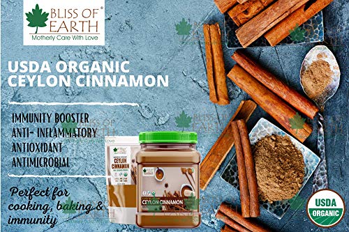 Bliss of Earth Certified Organic Ceylon Cinnamon Powder is a purer and healthier version of cinnamon. Ceylon cinnamon has a sweeter & delicate flavor than the more common Cassia cinnamon.In addition to its positive medicinal benefits ceylon cinnamon is ideal for all culinary usage.Our Ceylon Cinnamon is organically grown harvested and manually processed using traditional methods that have been used for centuries.Ceylon cinnamon known as true cinnamon is the purest form of cinnamon. Most commercial cinnamon is of the Cassia variety which has much less flavor or nutritional benefit since it contains much higher levels of coumarin. Ceylon cinnamon also has a more pleasant fragrance than the harsh pungent Cassia cinnamon. Use our pure cinnamon in your recipes and taste the difference.