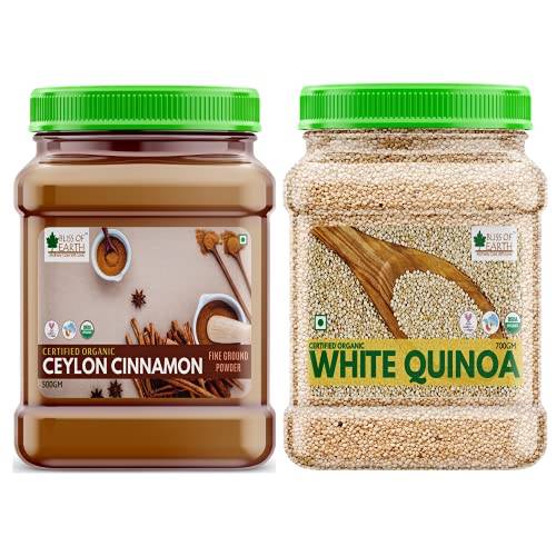 Bliss of Earth Certified Organic Ceylon Cinnamon Powder is a purer and healthier version of cinnamon. Ceylon cinnamon has a sweeter & delicate flavor than the more common Cassia cinnamon.In addition to its positive medicinal benefits ceylon cinnamon is ideal for all culinary usage.Our Ceylon Cinnamon is organically grown harvested and manually processed using traditional methods that have been used for centuries.Ceylon cinnamon known as true cinnamon is the purest form of cinnamon. Most commercial cinnamon is of the Cassia variety which has much less flavor or nutritional benefit since it contains much higher levels of coumarin. Ceylon cinnamon also has a more pleasant fragrance than the harsh pungent Cassia cinnamon. Use our pure cinnamon in your recipes and taste the difference. Bliss of Earth Certified Organic White Quinoa is one of the most popular healthfood. Its high in protein fiber magnesium B vitamins iron potassium calcium phosphorus vitamin E and various beneficial antioxidants. Its also one of the few plant foods that contain sufficient amount of all nine essential amino acids.