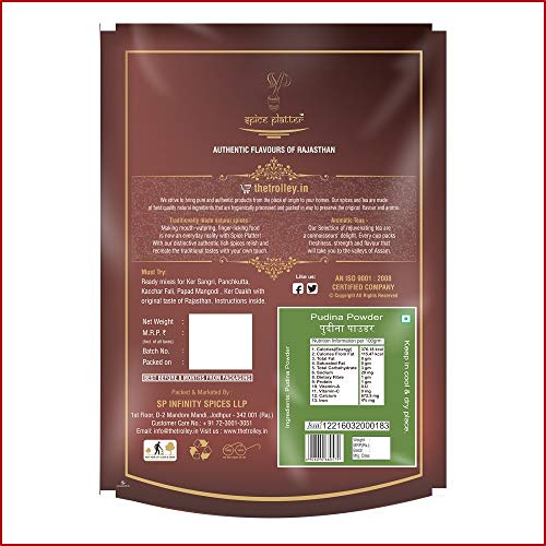 Combines natural 'pudina' (Mint) with a special blend of spices. Add to curds salads raitas and rotis. An excellent digestive and churan too!.