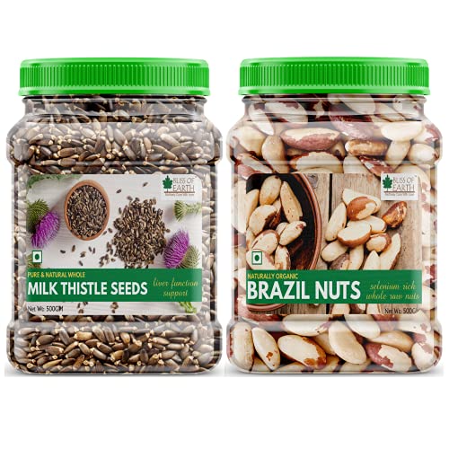 Bliss of Earth Milk thistle seeds are used as herbal remedy derived from the milk thistle plant also known as Silybum marianum. The active ingredients silymarin extracted from milk thistle is known to have antioxidant antiviral and anti-inflammatory properties. Bliss of Earth Brazil Nuts are nutritional powerhouse providing healthy fats vitamins and minerals. They are particularly high in selenium a mineral with potent antioxidant properties. Hazelnuts can be consumed as a raw snack roasted or added to baked dishes such as cake chocolates & shakes. All in all brazil nuts are an excellent and delicious source of nutrients for a healthy diet. Direction for use: Consume raw roasted or salted. Add to your cake chocolates or shakes.