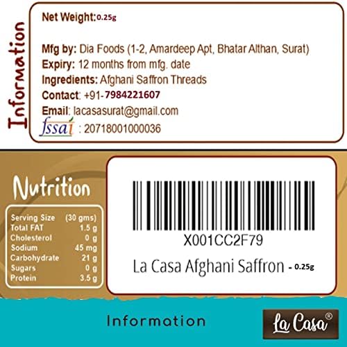 You'll LOVE our Premium Afghani Saffron --Here's Why: - 100% Natural Organic No preservatives or "fillers" & Great Flavor! - Packed in a no barrier Glass Container let us tell you how important that is when using high quality Saffron! - La Casa is a Indian Brand selling food products for over 15 years buy with confidence! - Enjoy Premium Afghani Saffron with your loved ones..