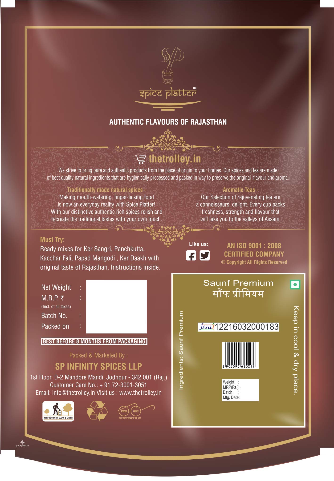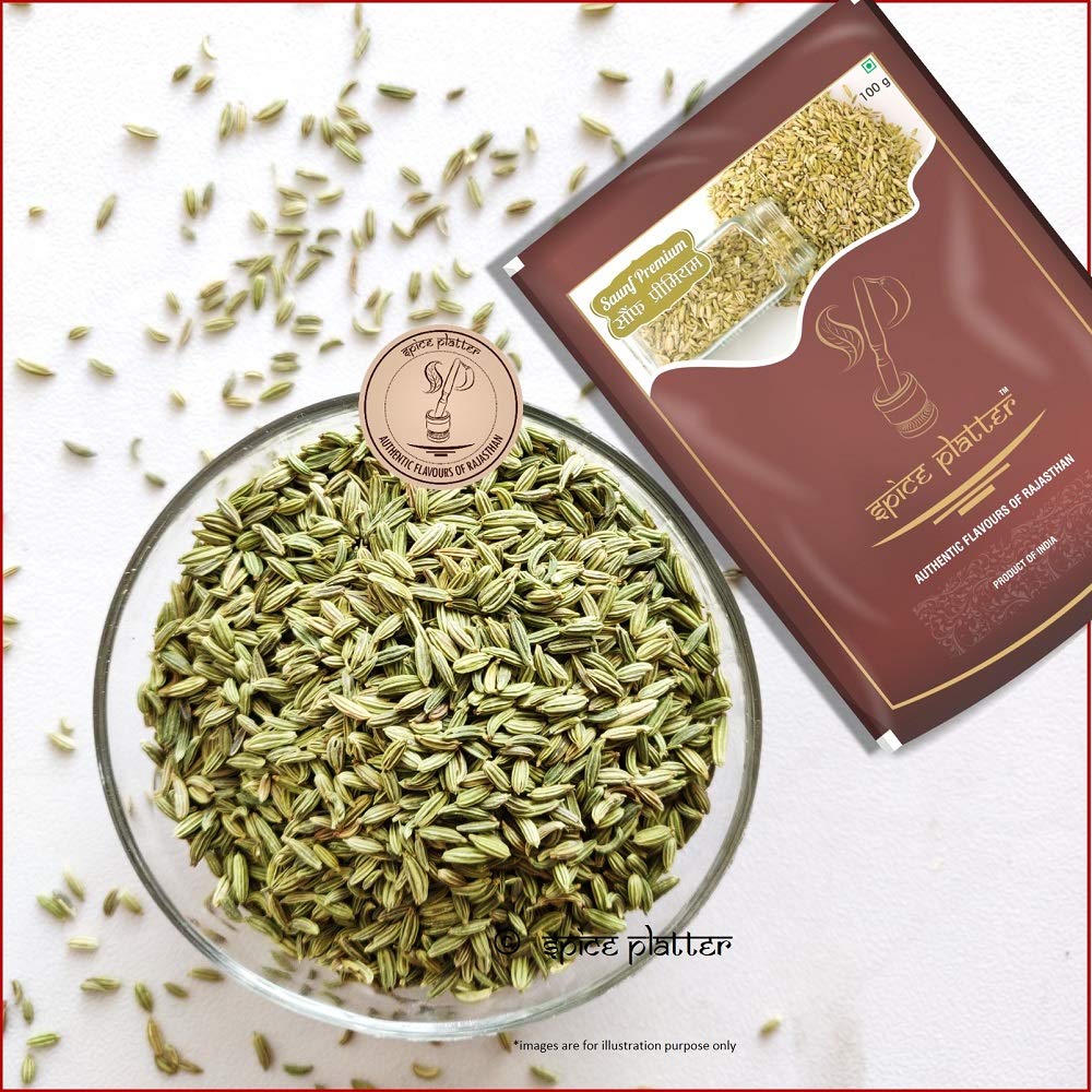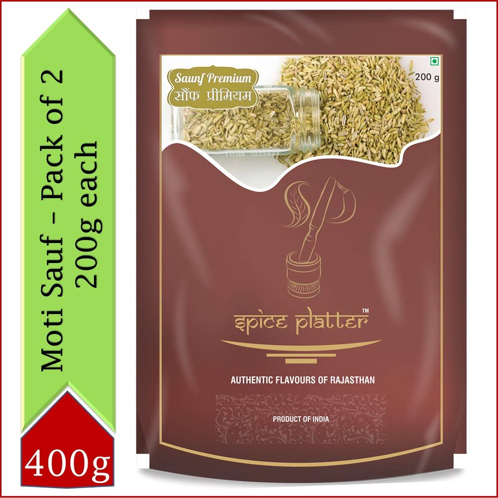 Spice Platter sauf is aromatic and flavourful herb. Pack of 2 - 200g each.Fennel seeds work well in a wide variety of foods ranging from breads pastries and other baked dishes.Also a well known mouthfreshner it is served at hotels restaurants to the guests and is also put in "paan".The flavour is pleasantly bitter but can be sweetened with dry roasting. Fennel seeds are used in lots of cuisines from Chinese (in five-spice powder) to Italian (with fish and roast pork) to Indian (in garam masala and some sweet dishes).sourced fresh direct from farms and packed in hygienic conditions this special Indian spice comes packed with manifold health benefits.Fennel seeds are soaked overnight in water and the water is consumed in morning as it is good for maintaining blood pressure and heart rate it helps in production of rbc it helps to curb carcinogenic diseases.