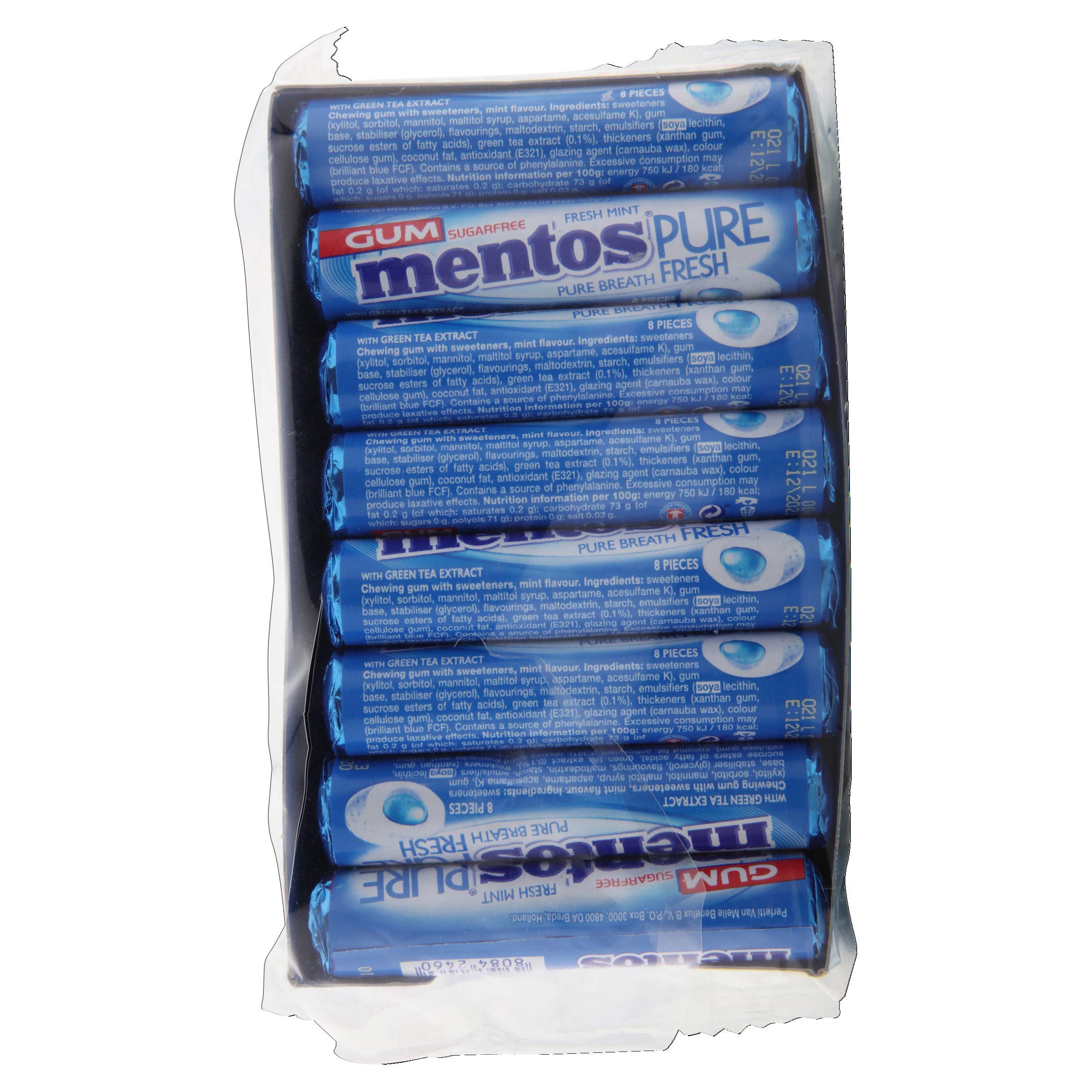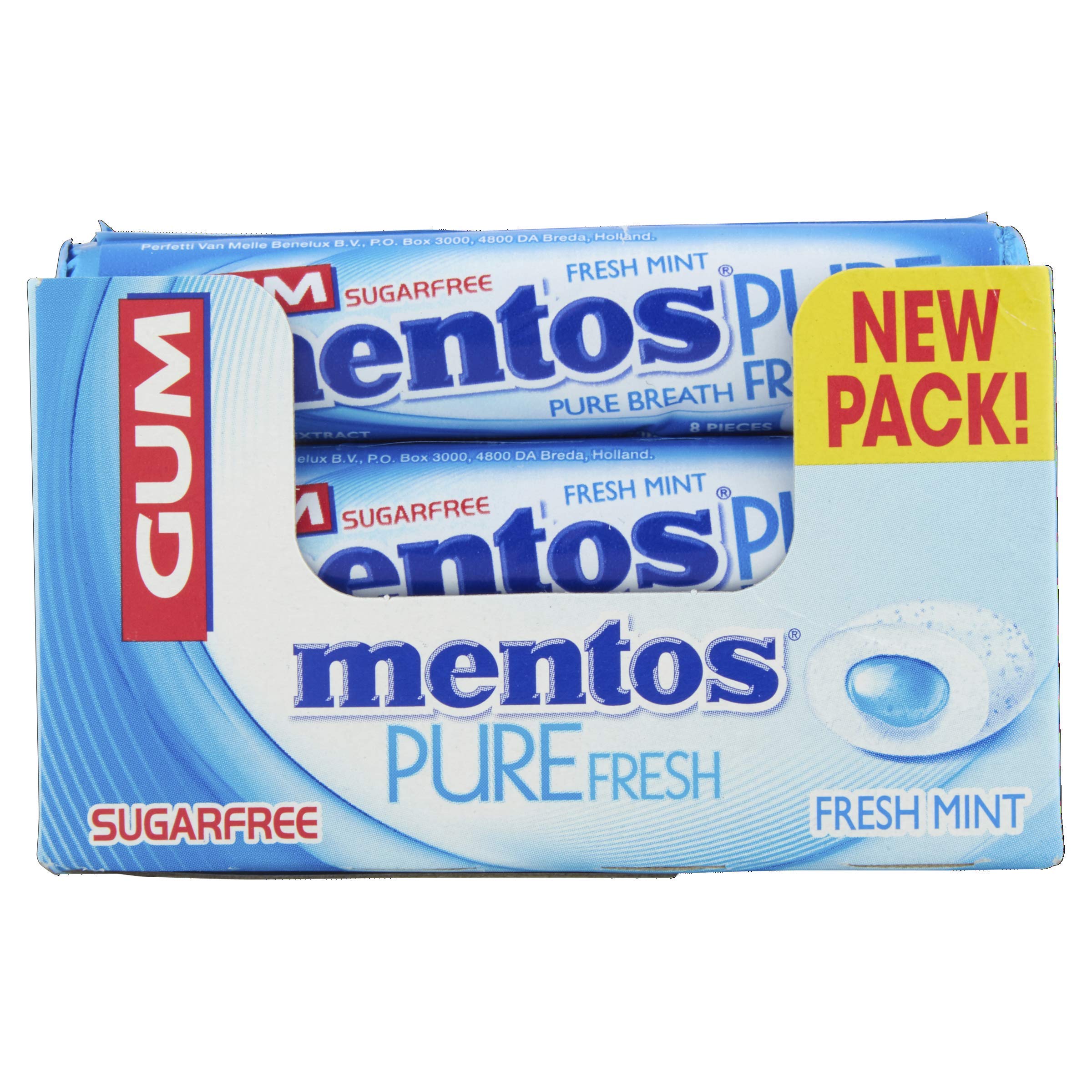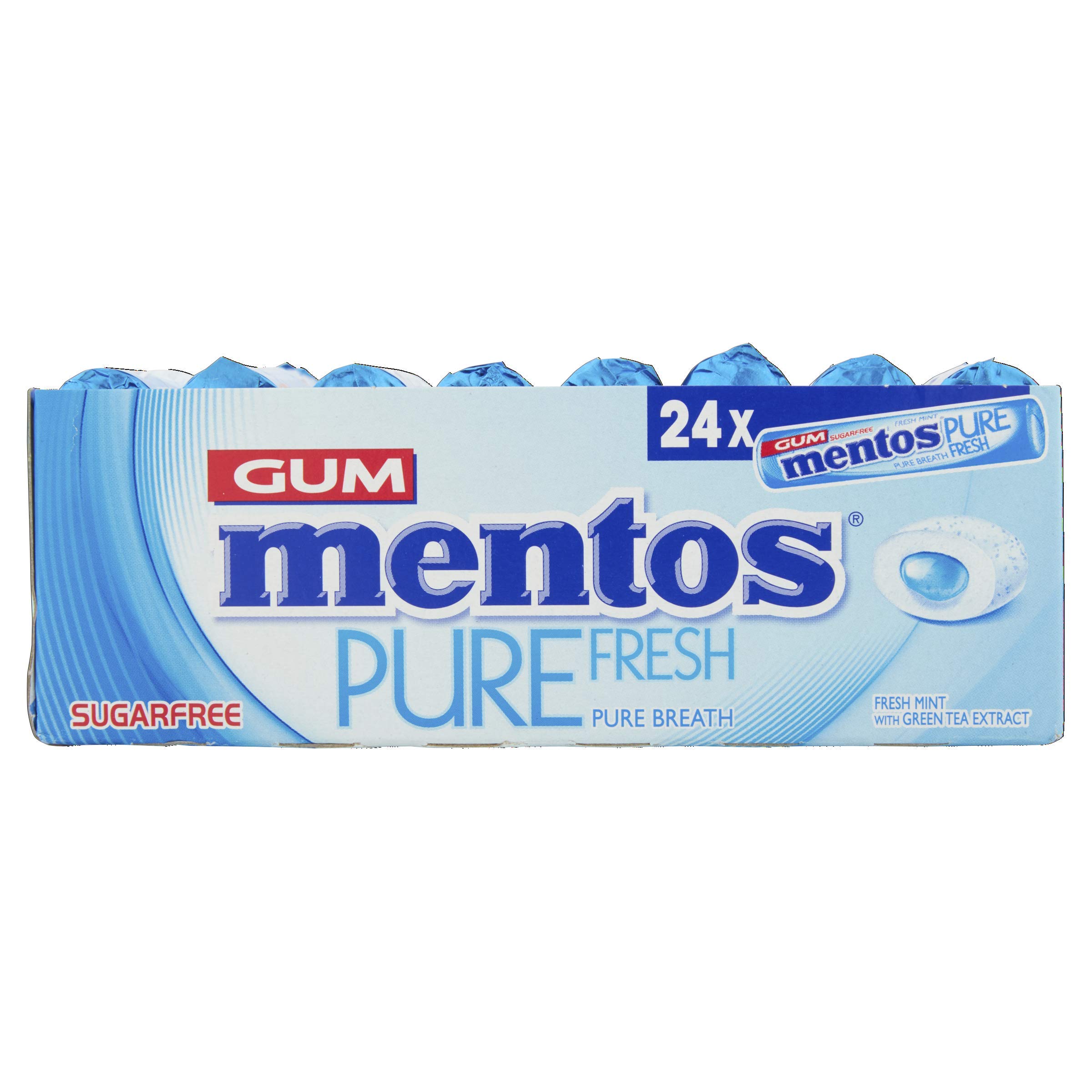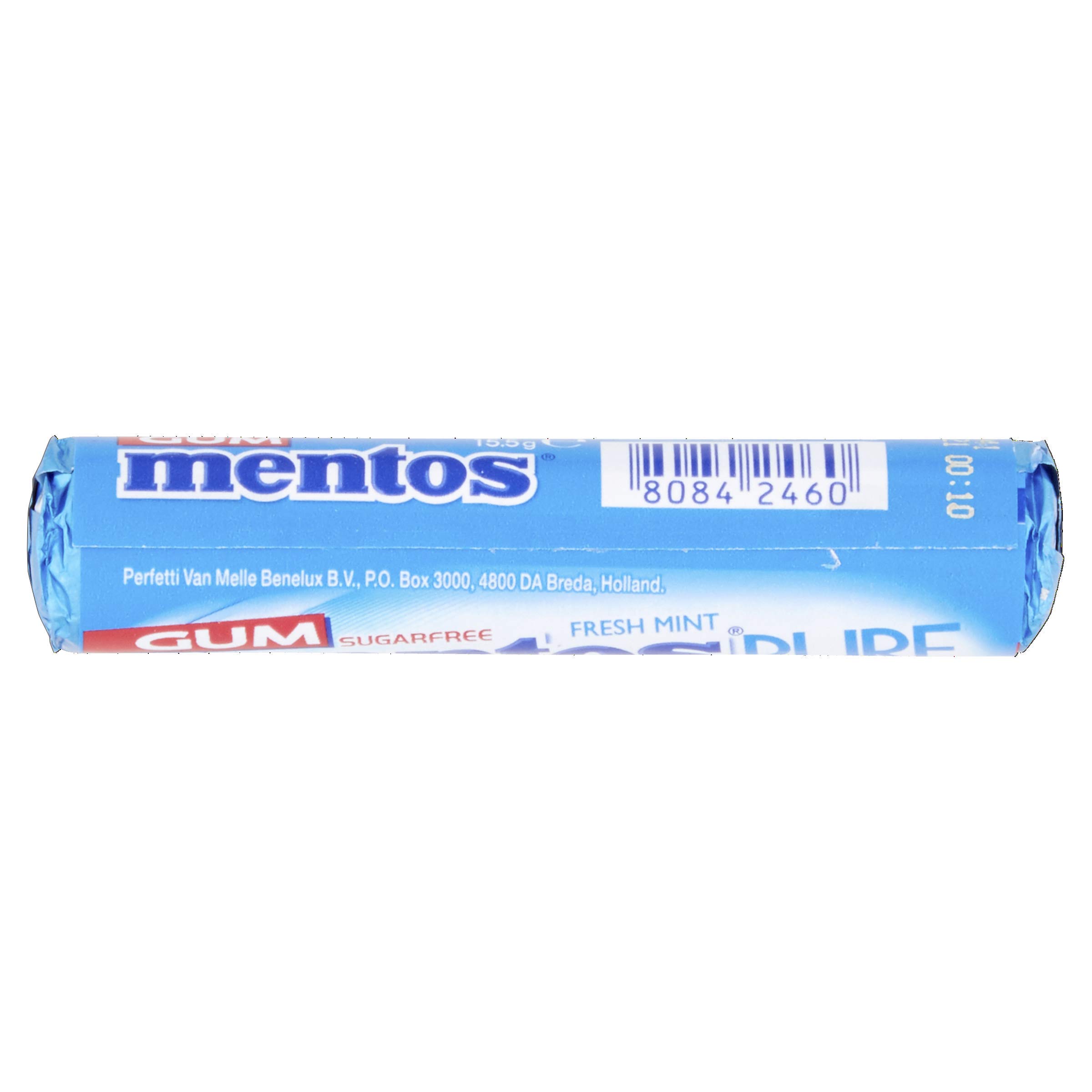 Mentos pure fresh - who says no to Mentos refreshing sugar-free chewing gum that is crunchy outside and chewy inside. Mentos helps in connecting with people. With itâs perfect balance of sweetness and mint Mentos has become popular worldwide. Pop one of these for instant cool breath and make the most of the moment get instant splash of refreshing mint flavoured liquid. What else? It is sugar free and with natural green tea extract keep this trendy bottle pack in the pocket car or a drawer for instant minty refreshment anytime.