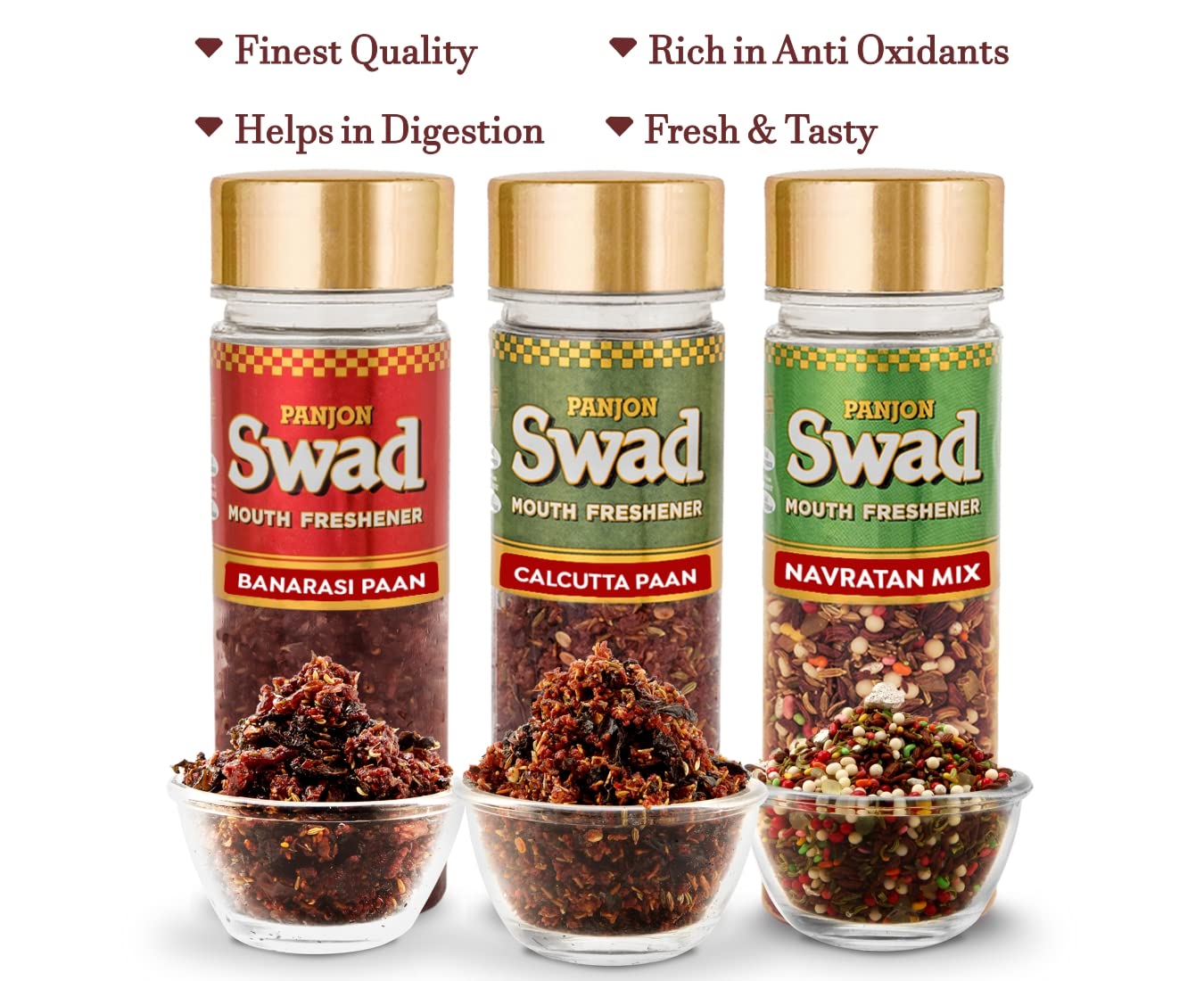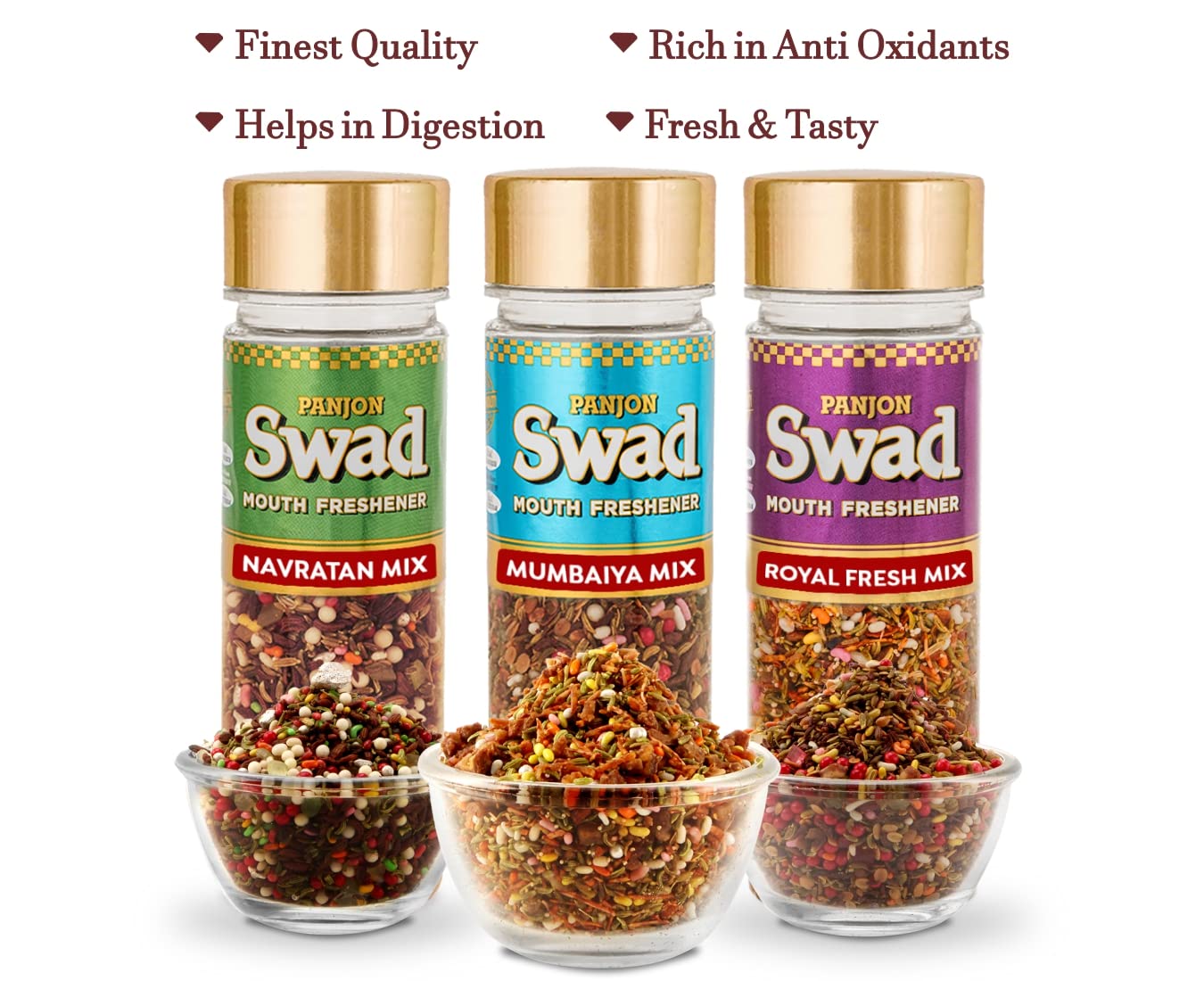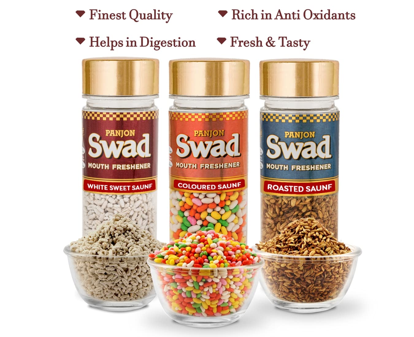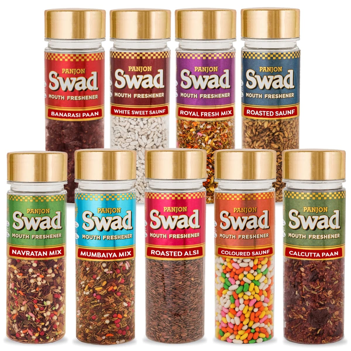 Swad the makers of Swad digestive drops candy present their premium range of mouth fresheners and pachak mukhwas to relish your cravings for tingling taste and mouth-watering aroma. Infused with the goodness of handpicked fruits and quality condiments Swad pachak stimulates the digestive enzymes and acts as an appetizer. It strengthens the digestive process and also promotes absorption of nutrients to cure stomach disorders like acidity gas and indigestion. Swad pachak's handpicked ingredients boost your immune system to keep you charged up all day. Swad pachak mouth fresheners range includes 20 flavours: (try all) shahi anardana special jeera goli white sweet saunf colored saunf roasted alsi Rajasthan roasted saunf shahi banarasi paan special Calcutta paan royal fresh mix shahi navratan mix anar amla khatta meetha khajoor ram ladoo khatta meetha aam papar mumbaiya mix mukhwas hing peda meetha amla chatpata amla chulbuli tamarind imli aam papar mango slices and many more. Also available combo offer packs and festive offer packs. We guarantee finest quality ingredients in each bottle of Panjon Swad pachak and mouth freshener. Try all our 20 flavours to tickle your taste buds. To maintain freshness shake the bottle upside down and keep it in a cool and dry place.