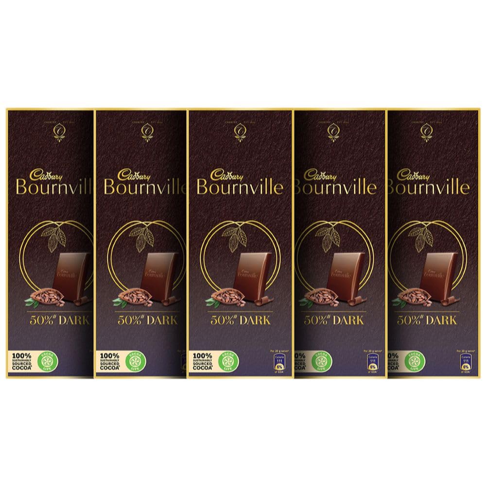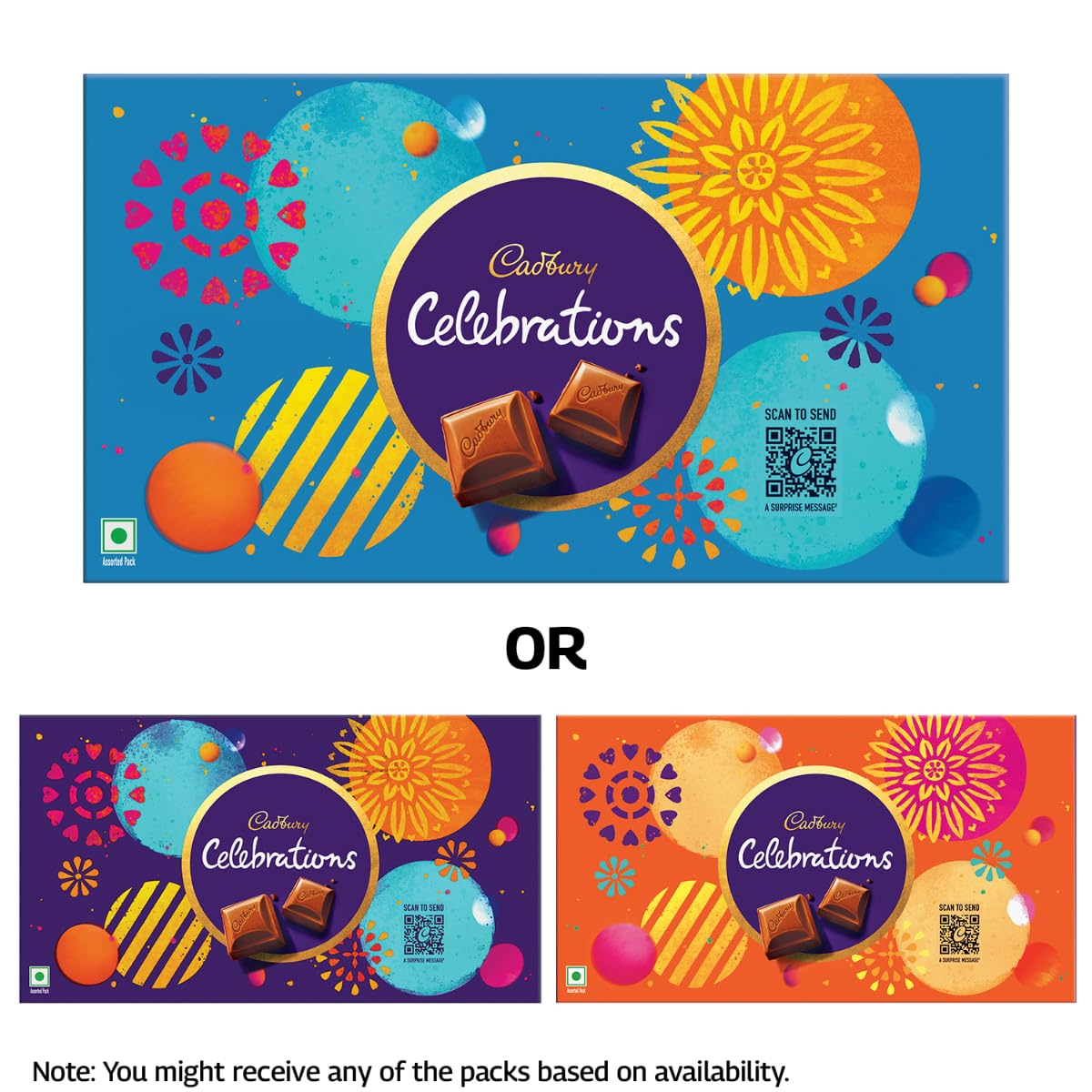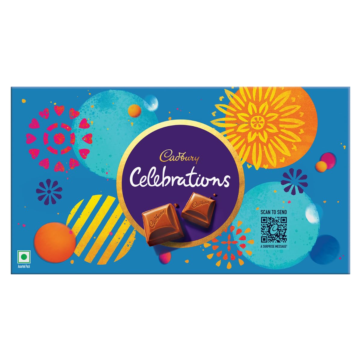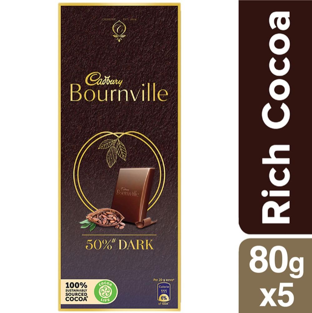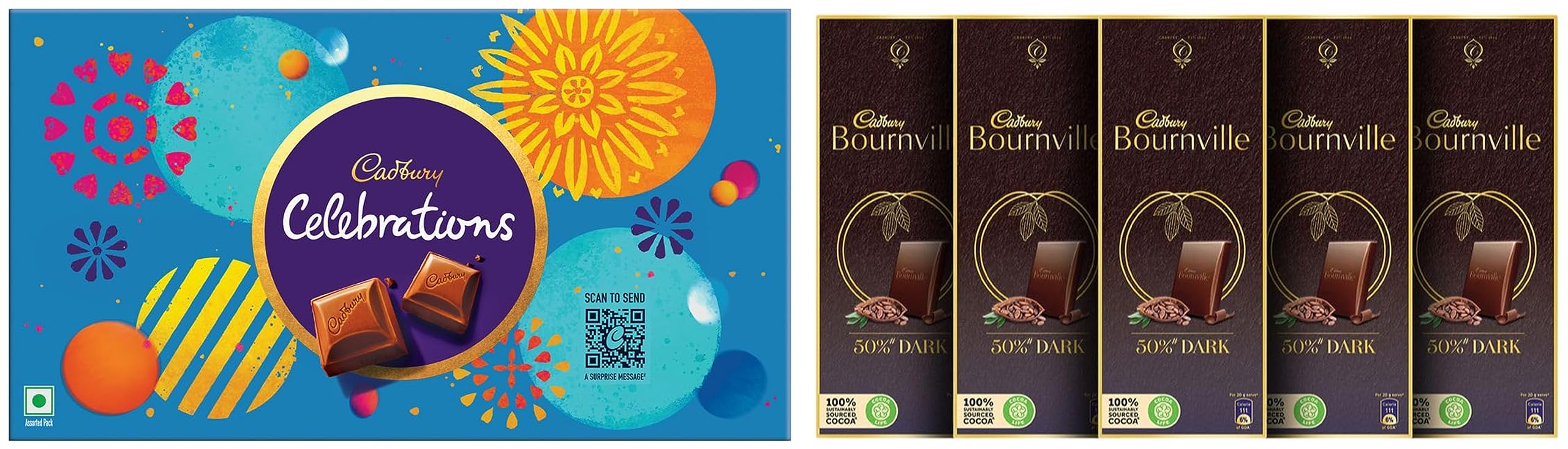 Cadbury Celebrations Chocolate Gift Pack 130.9 g (Pack of 4)Discover the collection of Cadbury Celebrations gift pack with your favourite Cadbury chocolates inside. This assorted gift pack contains 1 Unit of 5 Star-20g 2 Units of Gems -7.9g 2 Units of Cadbury Dairy Milk Milk Chocolate-12g. This collection comes in a pack which makes it a perfect gift to share with your friends and family.Discover the collection of Cadbury Celebrations gift pack with your favourite Cadbury chocolates inside. This assorted pack contains 2 units of 5 Star-20g 2 units of Gems-7.9g 5 unit of Cadbury Dairy Milk -12g 1 units of Cadbury Dairy Milk -23g. This collection comes in a premium pack which makes it a perfect gift pack to share with your family and friends. This pack contains 4 units of Cadbury Celebrations Assorted Chocolate Gift Pack 130.9g.Cadbury Bournville Rich Cocoa Dark Chocolate Bar 80 g (Pack of 5)Cadbury Bournville is a premium dark chocolate that delivers an intense fine and indulgent experience to lovers of dark chocolate! Each Bournville dark chocolate bar is made from the finest cocoa sourced from some of the best places around the world perfectly roasted for an intense taste. Dark chocolate with lower quantities of sugar is known for its health benefits. Cadbury Bournville is made from the finest ingredients that give you a rich intense lingering taste. This dark chocolate pack is perfect to gift or to reward yourself with an immersive intense experience. Along with this 50% dark chocolate also try other variants of Bournville chocolate 70% dark cranberry and fruit & nut. Every chocolate box of Cadbury Bournville is made from 100% sustainably sourced cocoa. It is suitable for vegetarians.