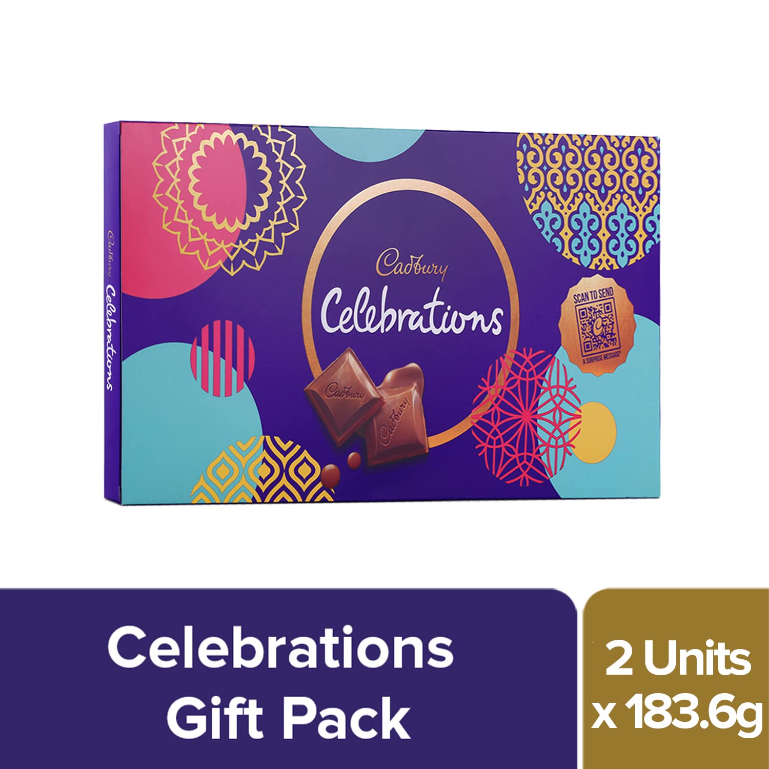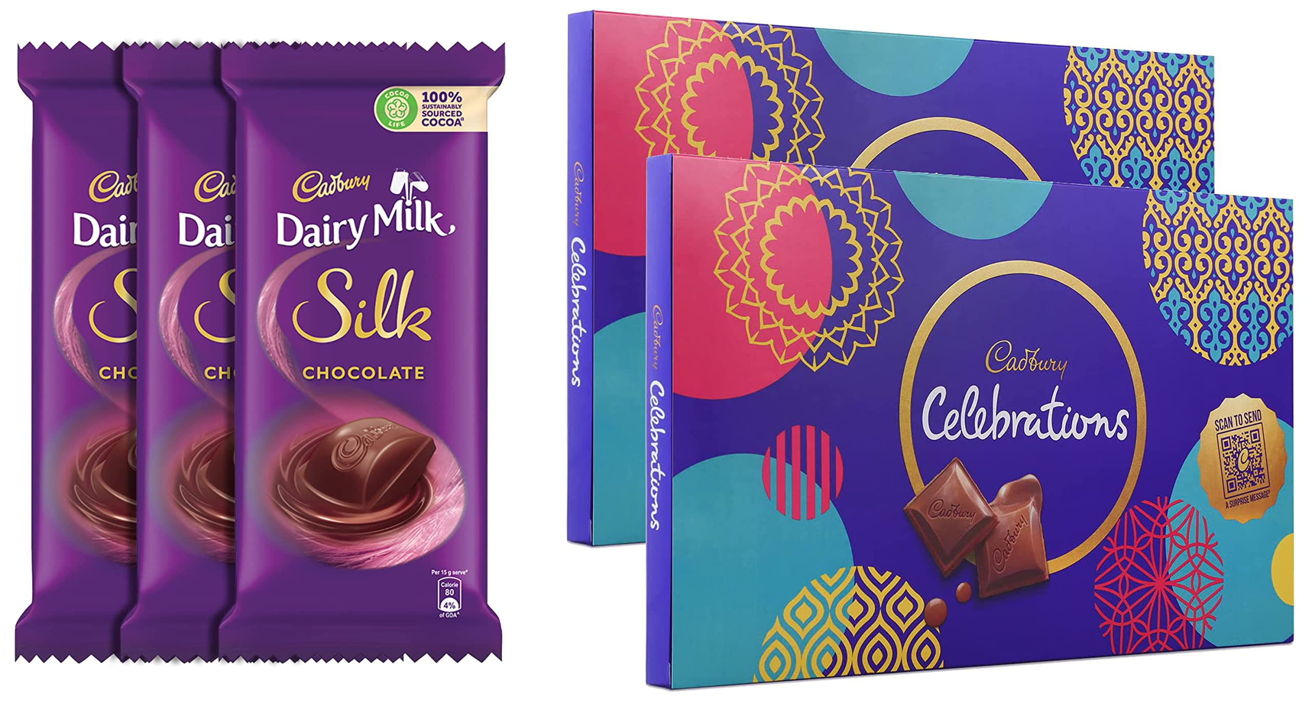 Cadbury Dairy Milk Silk Chocolate Bar 150g (Pack of 3)Cadbury Dairy Milk Silk is all about experiencing in the chocolate's richness and creaminess. The classic taste of Cadbury chocolates offer you a reason to celebrate every small and big occasion of happiness. In short Indulge in the premium chocolate delicacy.Cadbury Celebrations Assorted Chocolate Gift Pack 183.6g - Pack of 2Discover the collection of Cadbury celebrations gift pack with your favourite Cadbury chocolates inside. This assorted pack contains 3 unit of Cadbury dairy milk -23g 2 units of 5 star-22.4g 3 units of Gems-7.9g 3 units of Cadbury dairy milk -12g 1 unit of 5 star-10g. This collection comes in a premium pack which makes it a perfect gift pack to share with your friends and family. Cadbury celebrations is packed and delivered with frozen gel packs (reusable) to maintain temperature & quality during transit. This Pack contains 2 units of Cadbury Celebrations Assorted Chocolate Gift Pack 183.6g
