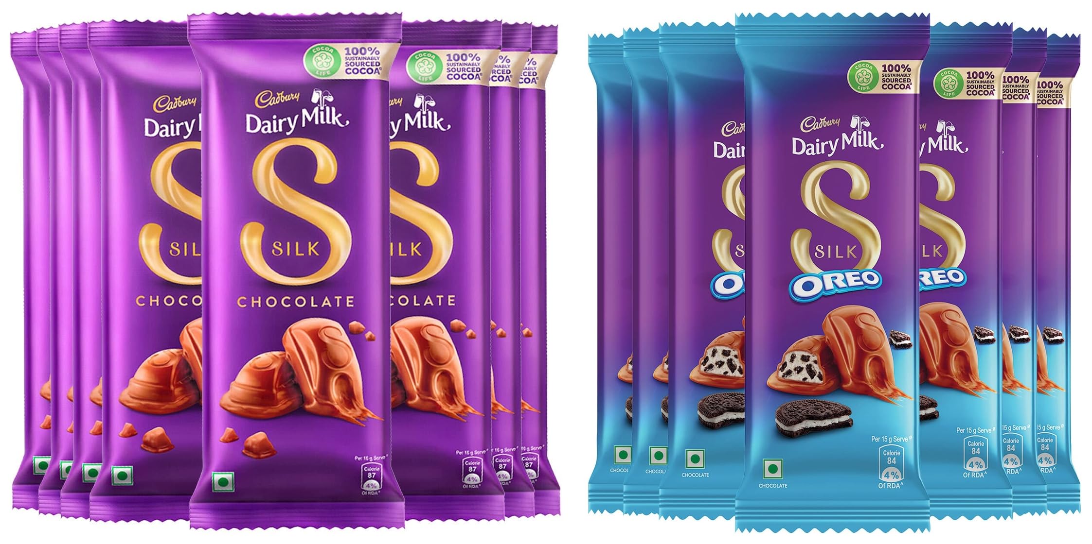 Cadbury Dairy Milk Silk Chocolate Bar 60g (Pack of 8)Cadbury Dairy Milk Silk is all about regaling in the chocolate's richness and creaminess. The classic taste of Cadbury chocolates offers you the reason to celebrate every small and big occasion of happiness. In short Indulge in the premium chocolate delicacy. This Pack Contains Cadbury Dairy Milk Silk Chocolate Bar 60g (Pack of 8).Cadbury Dairy Milk Silk Oreo Chocolate Bar 60g Pack of 7Cadbury Dairy Milk Silk is all about regaling in the richness and creaminess of the chocolate. Indulge in a rich smooth and creamy celebration. Silk: The classic taste of Cadbury Dairy Milk chocolates only more creamy more smooth more indulging. Cadbury Dairy Milk Silk Oreo is a delicious combination of creamy milk chocolate & crunchy Oreo. This pack contains 7 bars of Silk Oreo delivered safely with a cool gel pack. Every bar of Cadbury Dairy Milk Silk is made from 100% sustainably cocoa. It is suitable for vegetarians.