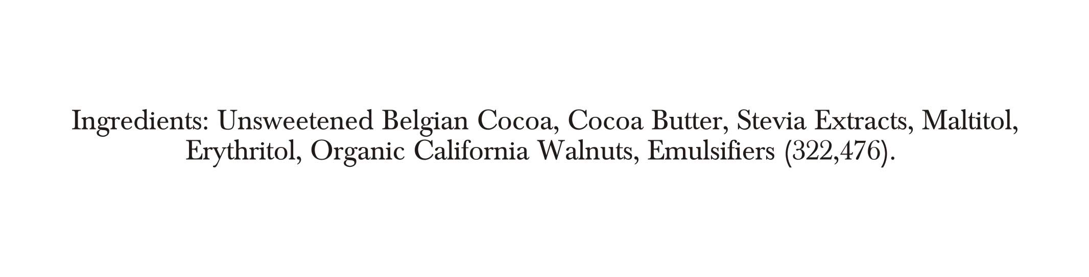 Special Feature: No sugar added Sweetened with stevia Sprinkled with Organic Walnuts Belgian 70% dark cocoa
