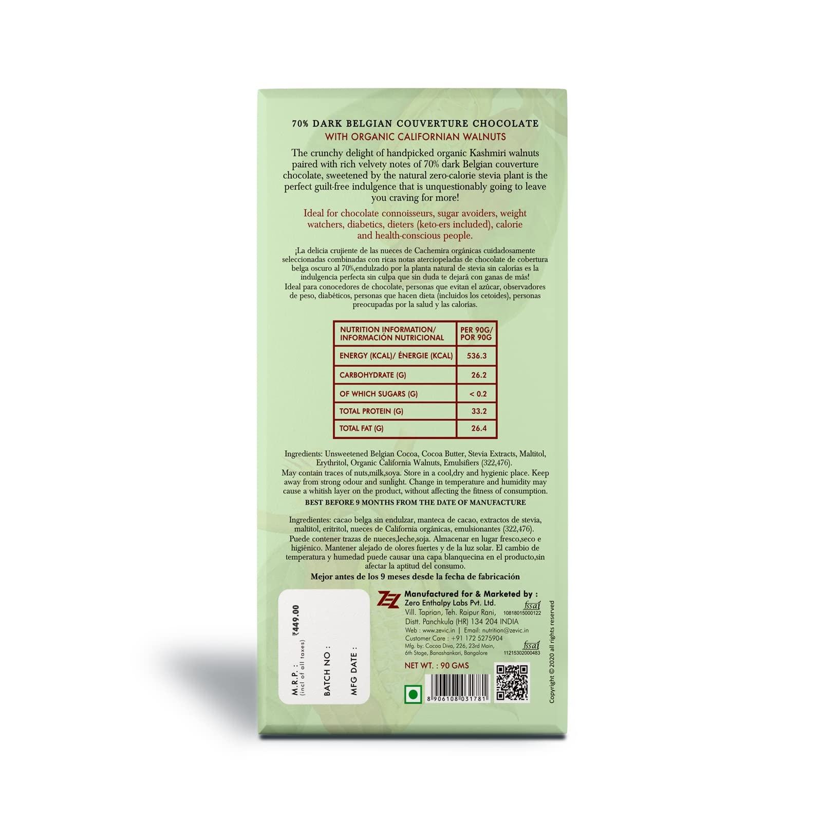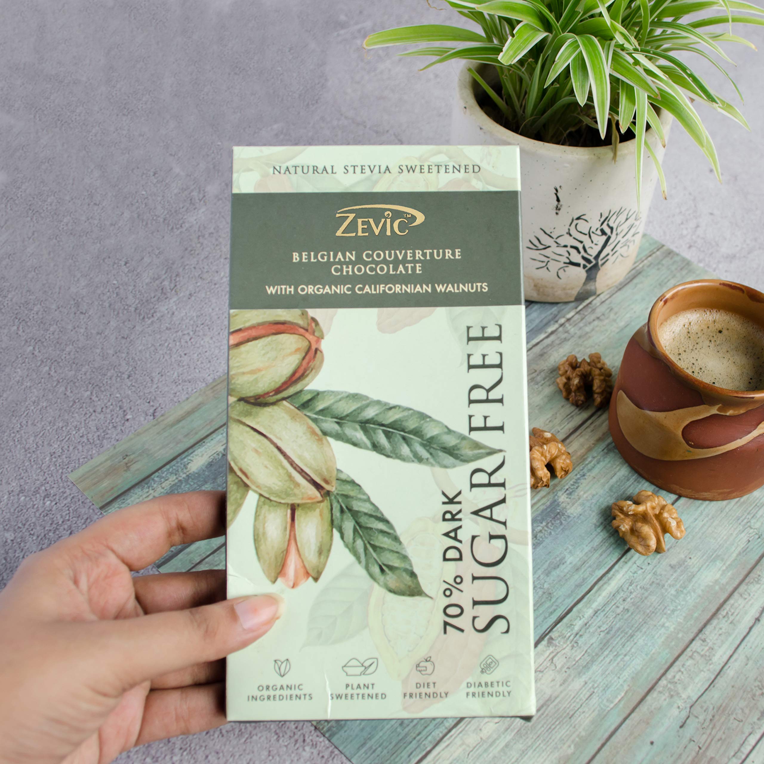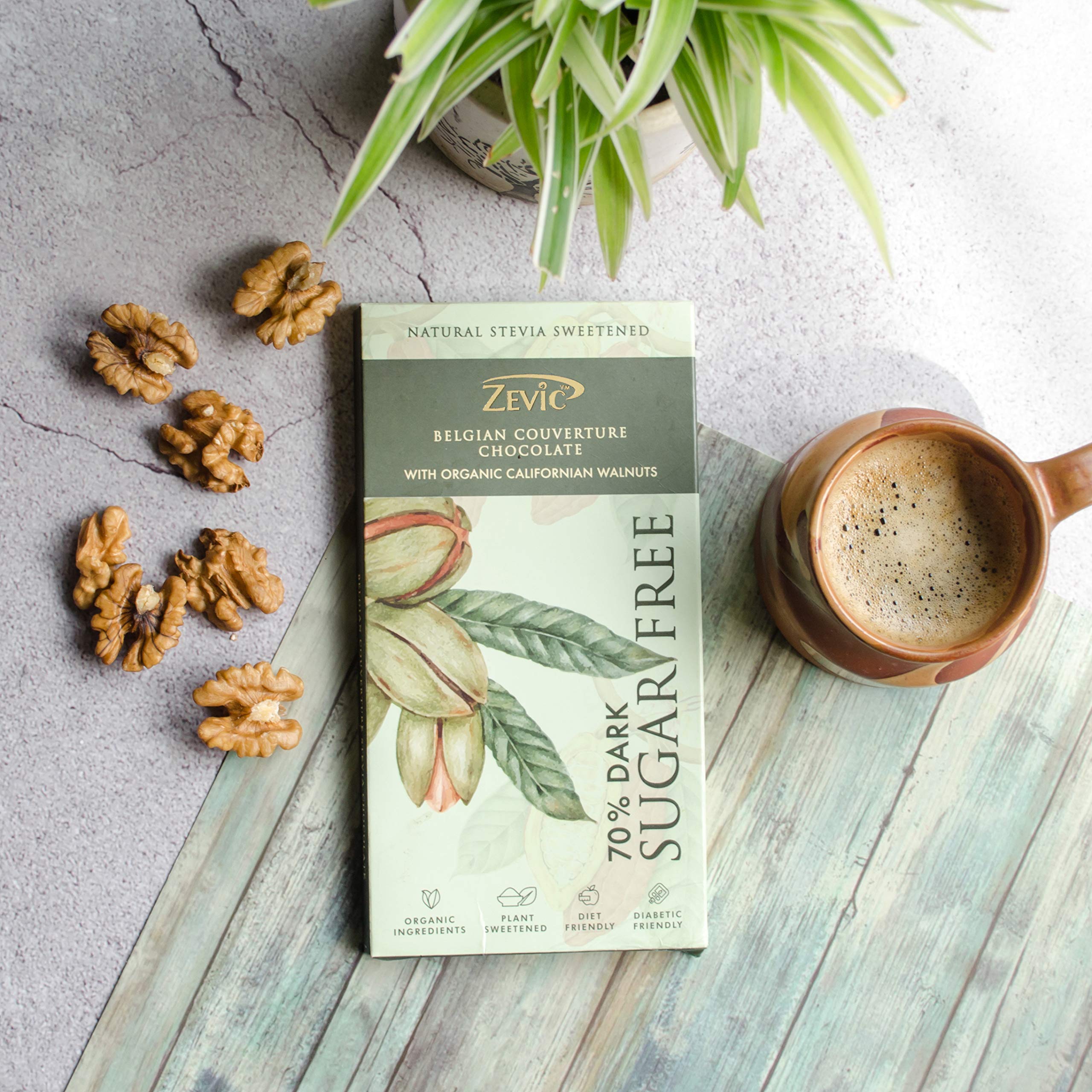 ZEVIC Sugar Free Chocolate with Organic Californian Walnuts | 70% Belgian Dark Chocolate Bar | Natural Stevia Chocolate | Keto Chocolate | Diabetic Friendly Chocolate | Vegan Healthy Chocolate 90g