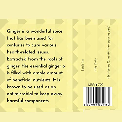 Pure undiluted ginger essential oil. Loaded with various benefits. Ginger oil is extracted from the roots of ginger the oil is filled with ample amount of beneficial nutrients.