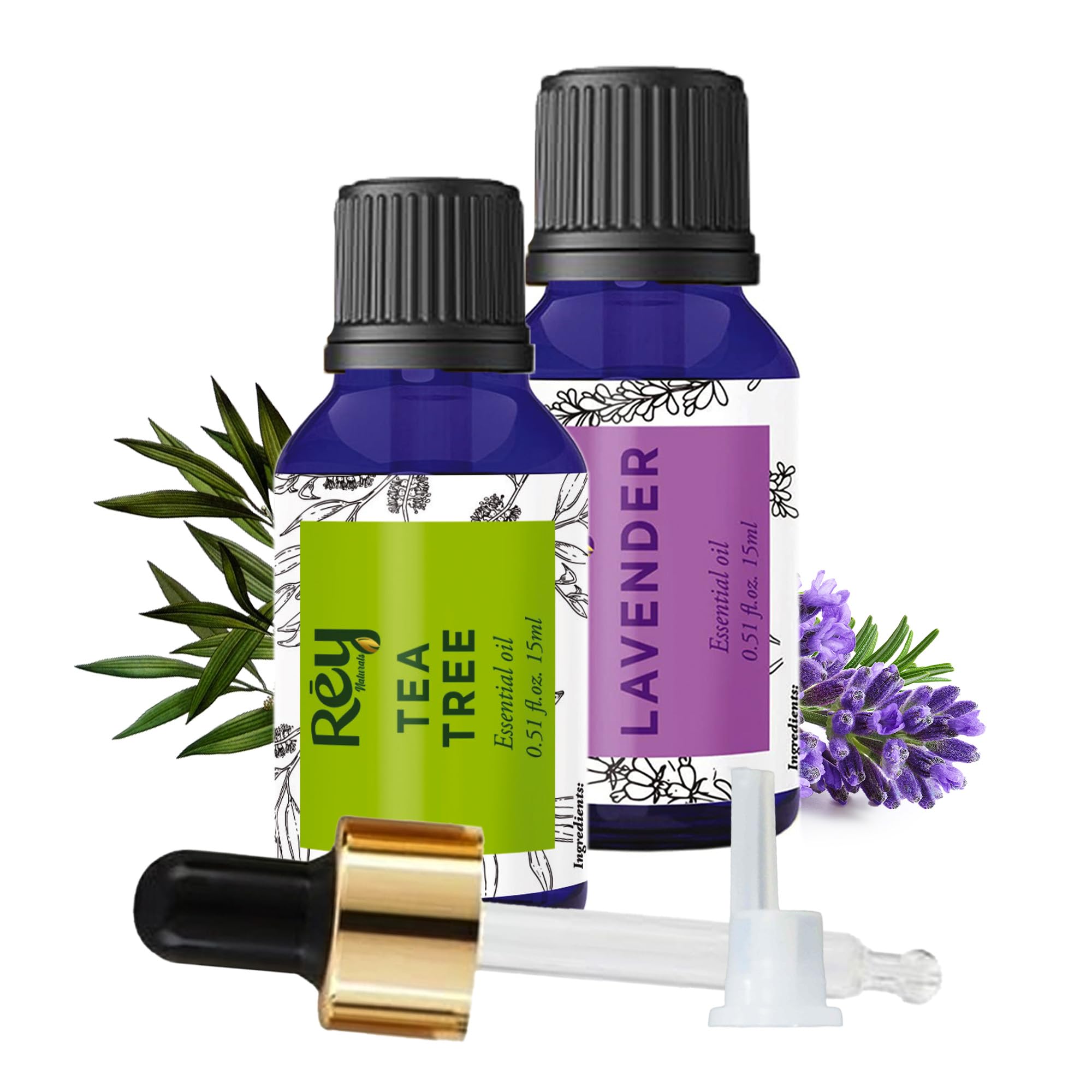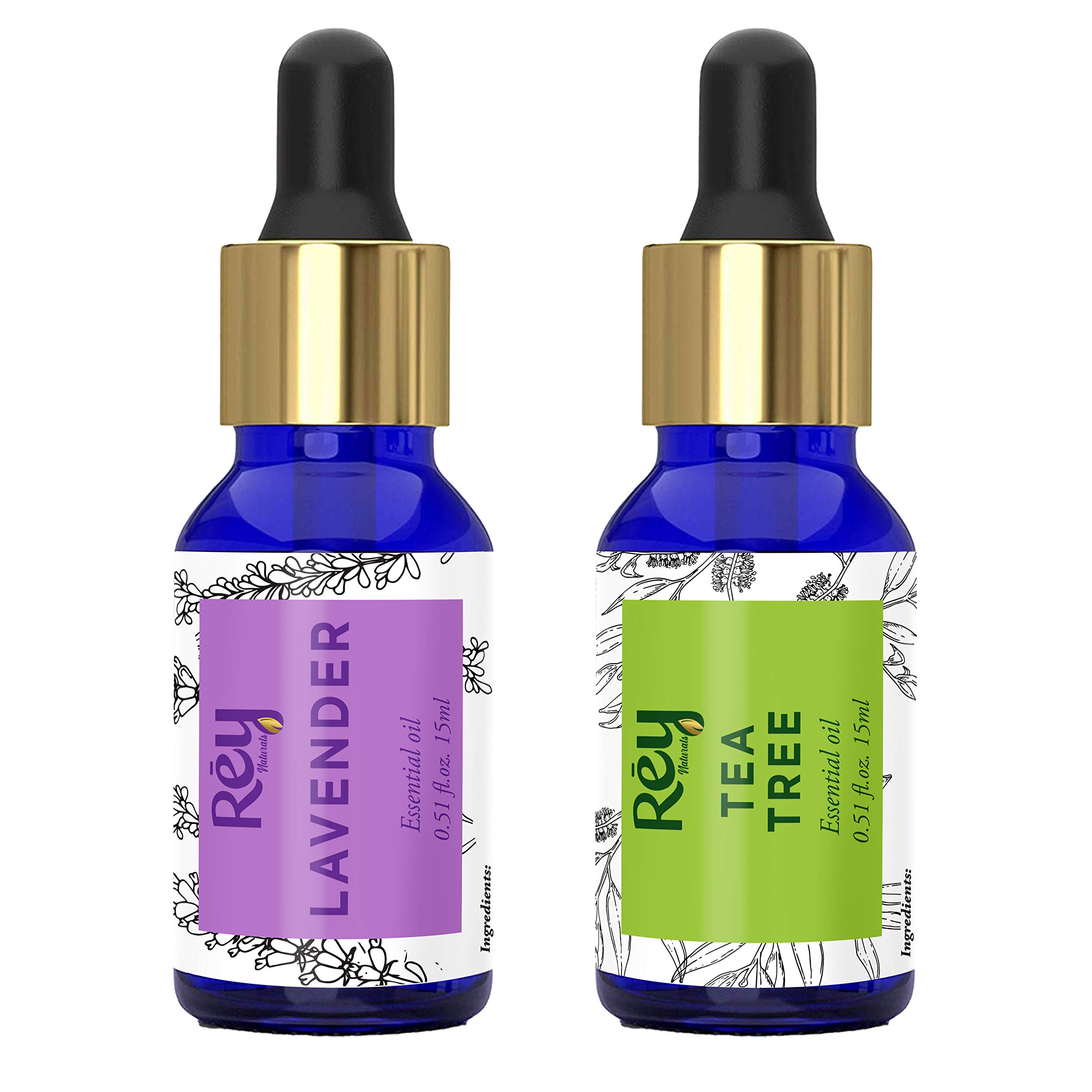 Rey Naturals Lavender Essential Oil & Tea Tree Oil For Dandruff & Acne Aromatherapy Stress Relief | Essential Oil For Diffuser Cold & Cough Dark Spots | For All Skin & Hair Types - 15ml*2