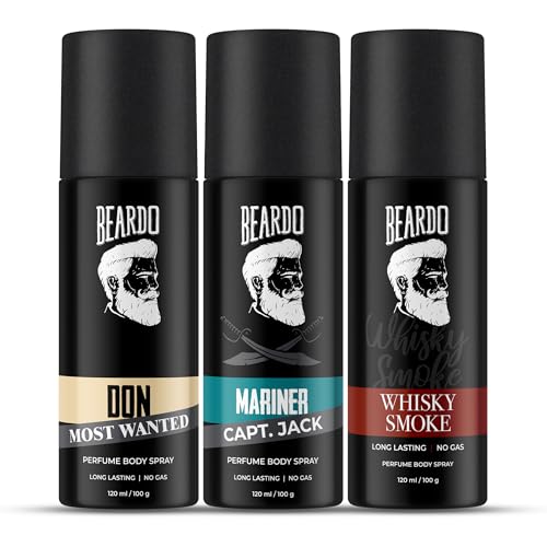 Beardo Deodorant Perfume Body Spray Set For Men (120ml x 3) | Don Deo with Most Wanted Fragrance - Citrus & Musky Scent | Mariner Captain Jack Body Spray with Aqua Notes | Whisky Smoke Deo Spray has Woody & Oudh Scent | Christmas gift for men | Gift For F