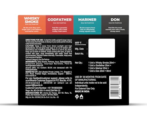 Beardo Perfumes Giftset For Men (Pack of 4 x 20ml) Whisky Smoke, Godfather, Tsunami and Black Musk | Long Lasting Perfume Musk & Woody Fresh Fragrance | Valentines day gift for husband | Gift for boyfriend | Gift for Men| Anniversay gift | Couple gift