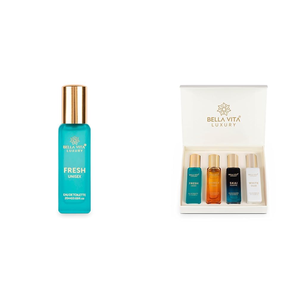 Bella Vita Luxury FRESH Eau De Toilette Unisex Perfume for Men & Women with Bergamot Ylang Ylang |Refreshing EDT Long Lasting Fragrance Scent 20mlTwisted Tale of Modern Classic. A mythical fragrance that rephrases ancient elegance! Accents of almond and Bergamot at the top are accentuated by lavender at its heart and ylang-ylang at its base to manifest an irresistibly iconic appeal. A breath of Fresh air this Eau De Toilette beautifully revives the glorious memories of the past; full of purity and versatility yet evoking limitless opportunities for the future!Bella Vita Luxury Unisex Eau De Parfum Gift Set 4 x 20ml for Men & Women with SKAI FRESH WHITEOUD HONEY OUD Perfume|Long Lasting EDP Fragrance Scent"Unbox a treasure of little luxuries with our Unisex Luxury Perfume Set that makes for the perfect gift for everyone. An arsenal of indulgence this box set carries some of Bella Vita Organic's most iconic fragrances. A little bit about the fragrances in the Bella Vita Organic Unisex Luxury Perfume Set: White Oud: The Spice Odyssey. Charmed by the tangy Artemisian Lemon at the top freesias at its heart and amber at its base The White Oud is a revelation of all things 'sweet' and 'spice'! Skai: Exudes Freshness and Sophistication. Top note of bergamot fuses perfectly with Ambergis at its base and pink pepper at its heart. The Skai Aquatic Eau De Cologne has a fresh appeal for the effortlessly sophisticated yet understatedly charming! Fresh: A mythical fragrance rephrasing ancient elegance. Top Bergamot note is accentuated by lavender at its heart and Ylang-Ylang at its base manifesting an irresistibly iconic appeal. A breath of Fresh air the Fresh Eau De Toilette is full of purity and versatility! Patchouli: An exhilarating blend that transpires us into the Imperial apothecary. Considered a powerful plant essence Patchouli orchestrates sweet spicy smokey and cedar(y) notes.