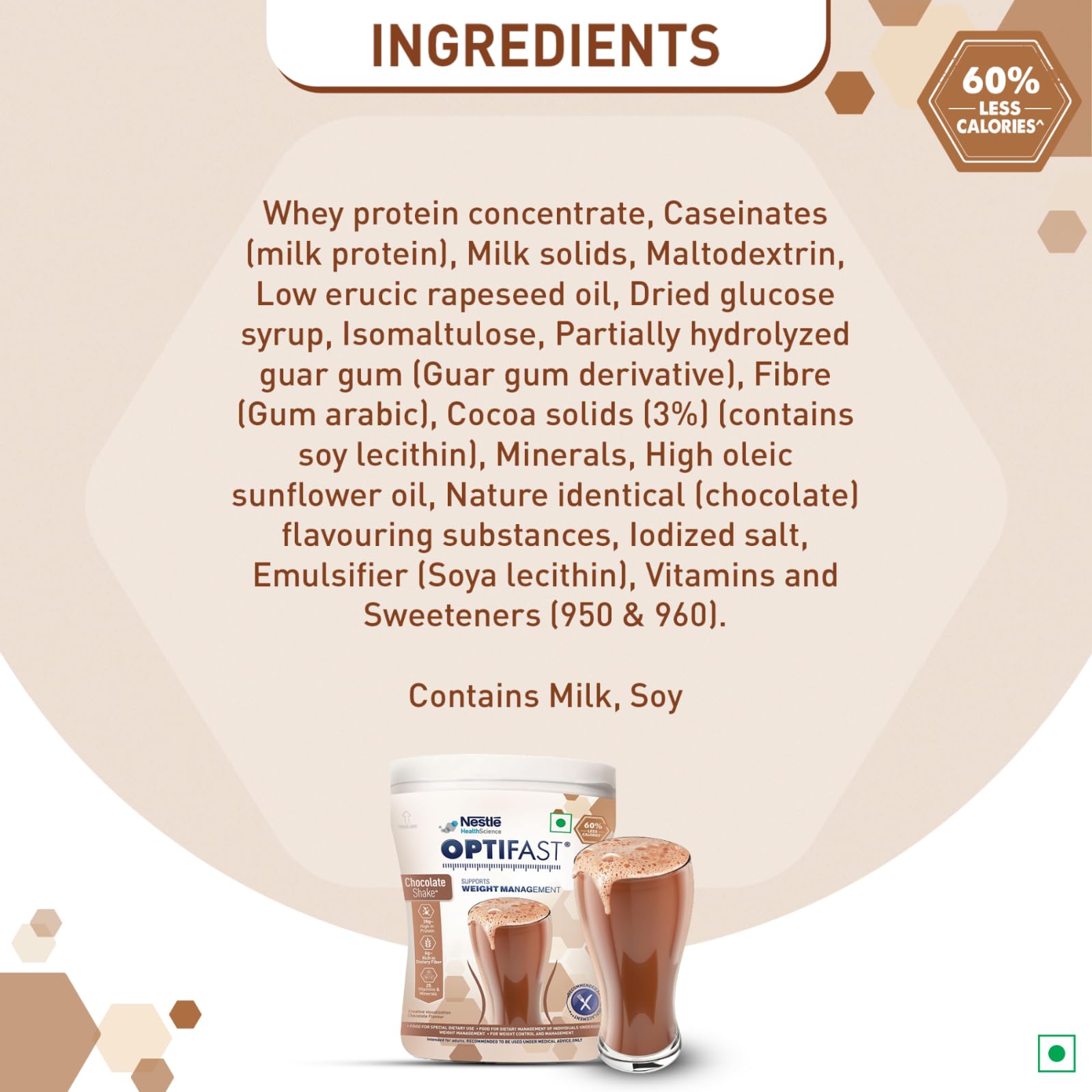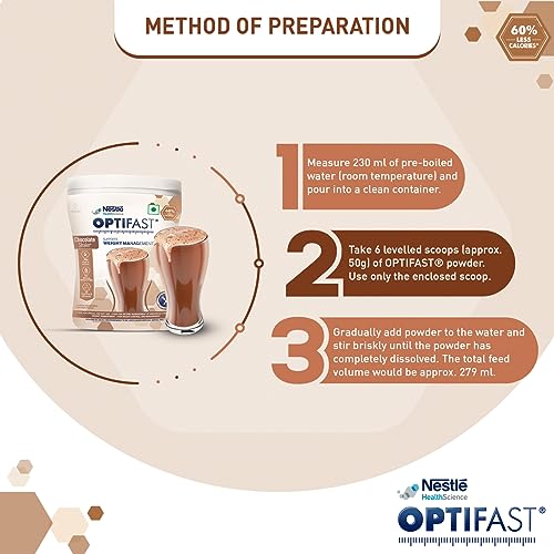 An ideal choice for weight control and management Losing weight is a challenging task and improper weight management could lead to adverse health issues. Out of multiple factors a healthy diet plays a vital role in your weight management journey. That's why we bring you Nestle Optifast Weight Management Shake which makes for a perfect choice for weight control and management. Scientifically designed low calorie meal replacement diet Nestle Optifast is a scientifically designed weight management meal replacement diet for the dietary management of individuals undergoing weight management. This diet powder for weight loss comes in a delicious chocolate flavour and contains 60% less calories as compared to a standard Indian meal. This weight management shake is high in protein and rich in fibre and it also contains 25 essential vitamins and minerals which take care of your daily nutrient requirement. Nestle Optifast chocolate shake also comes with low GI value which can improve the blood glucose control. Weight management made easy This Optifast shake is super easy to make and does not take up much time from your busy schedule. From running late to the office in the morning to a quick meal during the day this shake is your go-to solution for a tasty and fulfilling meal replacement diet. So what are you waiting for? Make Optifast powder a part of your weight loss diet and live a healthy lifestyle. Storage Instructions: Tear off the rings. Close the cap tightly after each use. Store in a cool dry and hygienic place. After opening the pouch consume the contents within 4 weeks. **Recommended to replace one or more meals a day with OPTIFAST as directed by your healthcare professional. ^As compared to a sample Indian meal recommended by NIN ICMR.