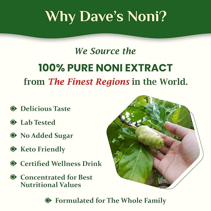 DAVE'S NONI 365 WELLNESS DRINK is a unique blend of the noni fruit and other natural ingredients, including morinda citrifolia. This nutraceutical drink is specially formulated to improve your overall wellness and health, making it the perfect to your daily routine.Dave's Noni Wellness Drink is also a great choice for those looking for a healthy drink.In addition to its health advantages, Dave's Noni Wellness Drink is also an organic choice. The organic ingredients in the drink help to ensure that you are consuming only the purest and healthiest ingredients.