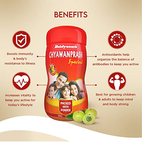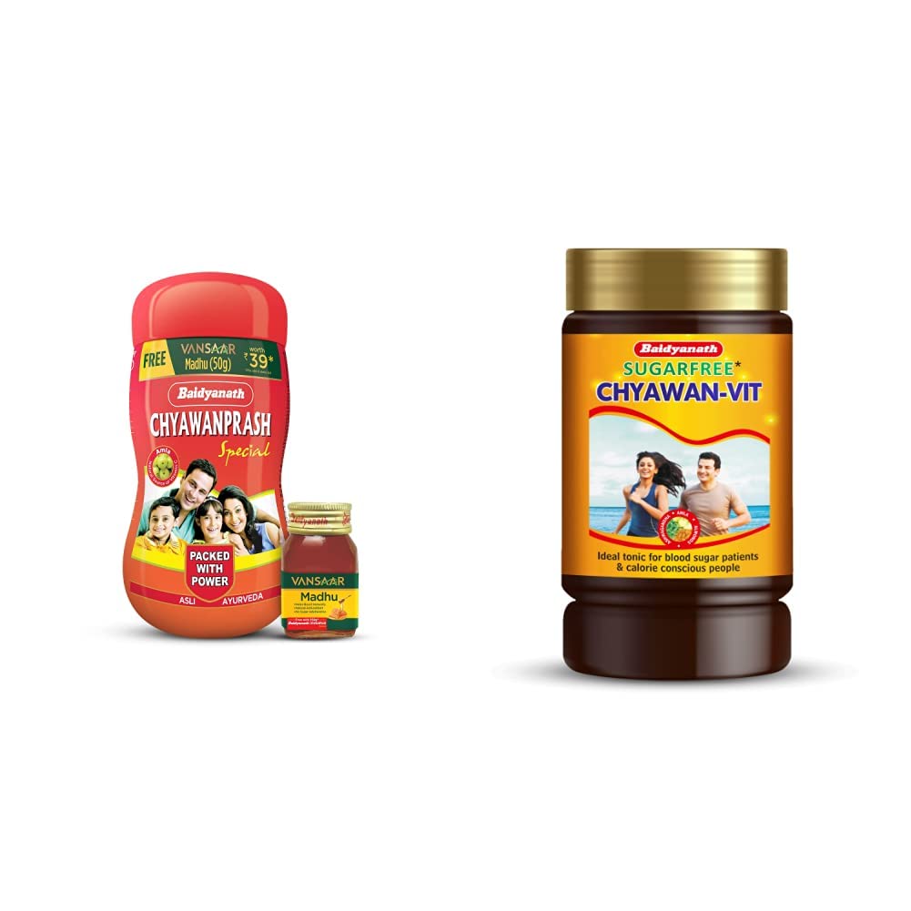 Baidyanath Sugarfree Chyawan Vit - Specially formulated Chyawanprash with No Added Sugar - 1kgBaidyanath Chyawan-Vit is a sugarfree variant of Baidyanath Chyawanprash which is recommended for individuals who are cutting down sugar intake. It is specially formulated as it is free from any added sugar. Every teaspoon of Baidyanath Sugarfree Chyawan-Vit contains the natural goodness of Almonds Ashwagandha and Amla a rich source of vitamin C minerals & potent herbal nutrients that are essential to boost the bodyâs immunity & metabolic activity.Baidyanath Chyawanprash Special - 1kg - All Round Immunity and ProtectionProtect your body every day and give your mind a dose of nature with Baidyanath Chyawanprash Special. Immunity and health derived from ancient Ayurvedic scriptures to fuel modern lives. Baidyanath Chyawanprash Special is enriched with Vitamin C-rich Amla and 52 essential herbs like pipal giloy madhu chhoti elaichi safed chandan and ashwagandha. It is loaded with antioxidants to neutralize the harmful effects of free radicals and boost energy to fight fatigue and tiredness. With all the goodness of nature Baidyanath Chyawanprash Special is a GMP certified product which is safe and effective for all age-groups. The product is plant-based made from herbs and hence is vegan. We gather the most efficacious herbs from different parts of India and pour our 100 years of knowledge and skills in making our products. A naturally healthy and immunity boosting solution for the whole family. Consume 1-2 tablespoonfuls twice daily for attaining the best results.