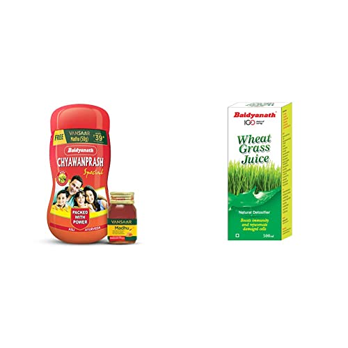 Baidyanath Chyawanprash Special - All Round Immunity and Protection - 1kgExtra energy active mind and increased immunity are the three major benefits of Baidyanath Chyawanprash Special. Years of establishment and potentiality of the brandâs promise has already made us stand out from the crowd. However when it comes to Chyawanprash. The day-to-day illness which is a common trouble in today's world Baidyanath Chyawanprash Special can help bolster your bodyâs immunity to fight them.Baidyanath Wheatgrass Juice - Natural Herbal Detoxifier - 500mlBaidyanath Wheat Grass juice is 100 percent pure natural and free from any synthetic flavour and colour. It is made using organically grown Wheatgrass and contains many vitamins and minerals that your body needs for complete nutrition. It helps in building immunity and strength. The nutrients in wheatgrass juice help in getting rid of toxins and impurities. The chlorophyll present in Baidyanath Wheat Grass Juice helps to detoxify the body and promotes healthy digestive functionalities. Regular consumption can help improve overall health and keep you active and energetic.
