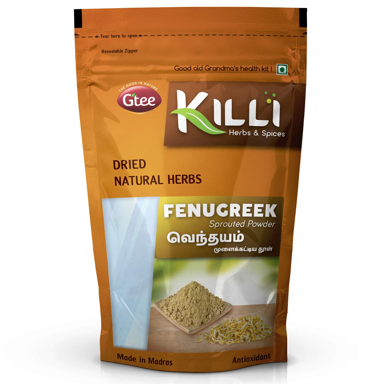 KILLI® SPROUTED FENUGREEK POWDERHEALTH BENEFITSFenugreek sprouts are highly valued for its health benefits. Nourishes skin increases hair growth breast enlargement increases lactation and support weight loss. It also improves digestion increases good cholesterol and a natural detoxifier.HOW TO MAKESoak one teaspoon (5g) of Killi Sprouted Fenugreek powder in 150ml of warm water for half an hour mix and drink. Can be mixed to salads and roti dough. KILLI® HERBS & SPICESKILLI® having its special care and scientific approach in every stop of processing of herbs to retain the active principle taste and aroma explores the value of traditional herbs with uncompromising quality and taste to customers. We believe that the traditional wisdom is the wealth of our Nation. KILLI's unique herbal combinations offers its customers the best healthy solutions. KILLI® is a Registered Trademark of Gtee®