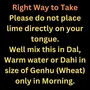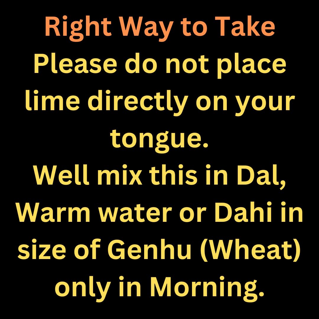 How to Use :- Please do not place lime directly on your tongue. Use this in Dal Warm water or Dahi in size of Genhu (Wheat) only in Morning.
