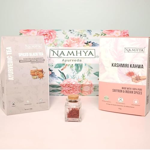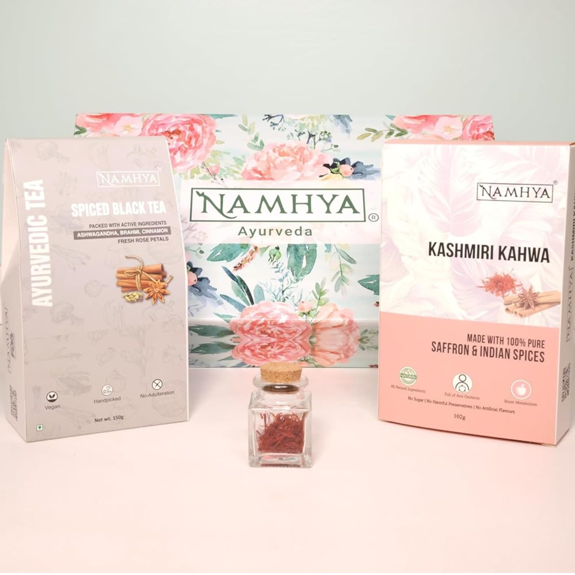 Namhya Foods Premium Divine Diwali Gift Box is our signature combo of Ayurvedic Spiced Tea Pure Kashmiri Saffron and Kashmiri Kahwa Tea blends crafted with love and care in a beautiful floral gift box. This set includes- Namhya Ayurvedic Tea 150g X 1 Namhya Pure Kashmiri Saffron 1g X1 Namhya Kashmiri Kahwa Tea 100g X 1 Premium Floral Gift Box X1. This gift set is perfect for all occassions for corporate or festive gifting. This diwali light up with wellness with Namhya.