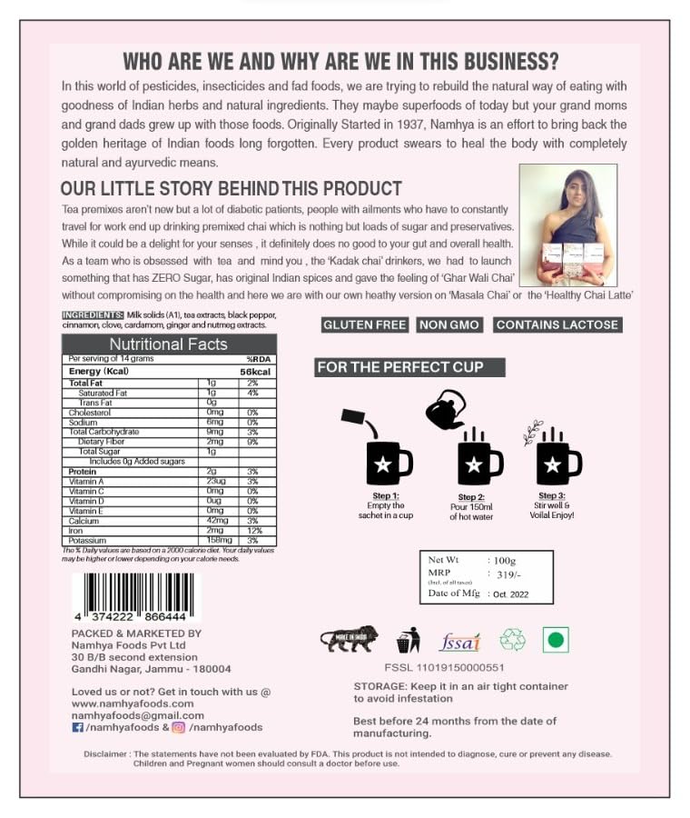 Experience the authentic flavors of Indian masala tea with Namhya Instant Masala Tea Premix! Indulge in a rich and aromatic cup of tea made from a perfect blend of premium tea extracts and a harmonious combination of Black Pepper Cinnamon Clove Cardamom and Ginger.Key Features:1. Authentic Indian Masala Tea: Namhya brings you the true essence of Indian masala tea carefully crafted to deliver an unforgettable tea-drinking experience.2. Easy to Prepare: Enjoy the convenience of our instant masala tea premix. Simply add hot water stir and savor the goodness within minutes.3. Premium Ingredients: We prioritize quality and flavor above all else. Our tea premix is made from the finest tea extracts and infused with a tantalizing mix of Black Pepper Cinnamon Clove Cardamom and Ginger.4. Gluten-Free and Non-GMO: We understand the importance of dietary preferences and health-conscious choices. This masala tea premix is gluten-free and free from genetically modified organisms.5. Aromatic and Invigorating: Each sip will take you on a sensory journey with the invigorating aroma and well-balanced blend of spices leaving a lasting impression.6. Perfect Anytime Beverage: Whether you want to kickstart your day take a refreshing break or unwind after a long day Namhya Instant Masala Tea Premix is the ideal beverage companion.7. Portable and Travel-Friendly: Each 100g pack is designed to be easily carried with you allowing you to enjoy a delightful cup of masala tea anywhere anytime.Savor the harmonious symphony of flavors in every cup of Namhya Instant Masala Tea Premix. Add it to your cart now and experience the magic of traditional Indian masala tea with a modern twist. Make tea-time truly special with Namhya!
