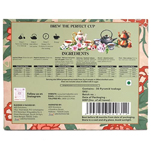 "IN THE BOX: Kashmiri Kahwa tea - Our authentic kahwa chai pays tribute to the beauty of Kashmir a paradise of mountain lakes pine forests and snow-clad peaks. The green tea blend is infused with almonds safflower cardamapricot saffron transforming your hot brew into an indulgent elixir. Jasmine green tea with peach - This classic aromatic jasmine green tea has a fruity twist- green tea leaves are combined with quality jasmine flowers and juicy peach to form a magical infusion that is harmonious and shall transport you to a Zen state of mind! Hibiscus rose green tea with apple - Enjoy an authentic Turkish apple tea which is a mix of refreshing hibiscus rose green tea infusion with apple bits strawblack currants and lemon peel transporting you to Turkey's bustling markets. Rose green tea with lychee - Enjoy the wonderful floral aromas of rose green tea with lychee. An all-time favorite since our launch you can enjoy this tea both hot and cold. It makes for a wonderful brew too. Jasmine green tea - Sencha green jasmine tea has been drunk for centuries in the Far East and is rich in antiwhich have a host of health benefits. It is also said to promote a healthy glowing skin. This fragrant tea shall your mind. Rose Oolong tea - our rose oolong tea is an alluring tea blend infused with crushed rose petand rosebuds. The exquisite oolong tea base evokes a sense of calm and tranquility."