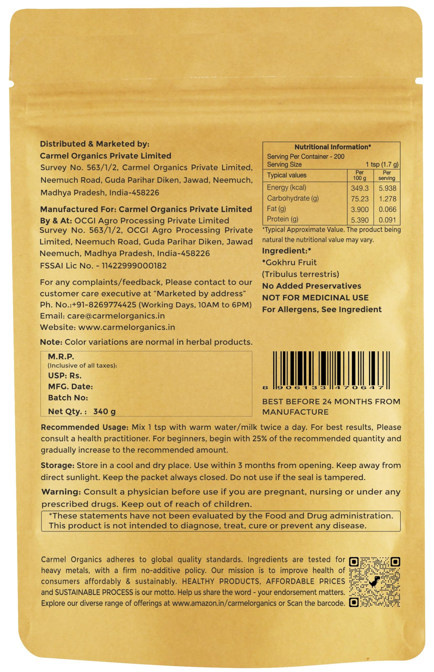 CARMEL ORGANICS Gokhru/Gokshura/Tribulus Terrestris Powder 340 Gram Boost Strength & Stamina Naturally | Non GMO | No Added Preservative or Additives | Palleru/Nerunjil Powder