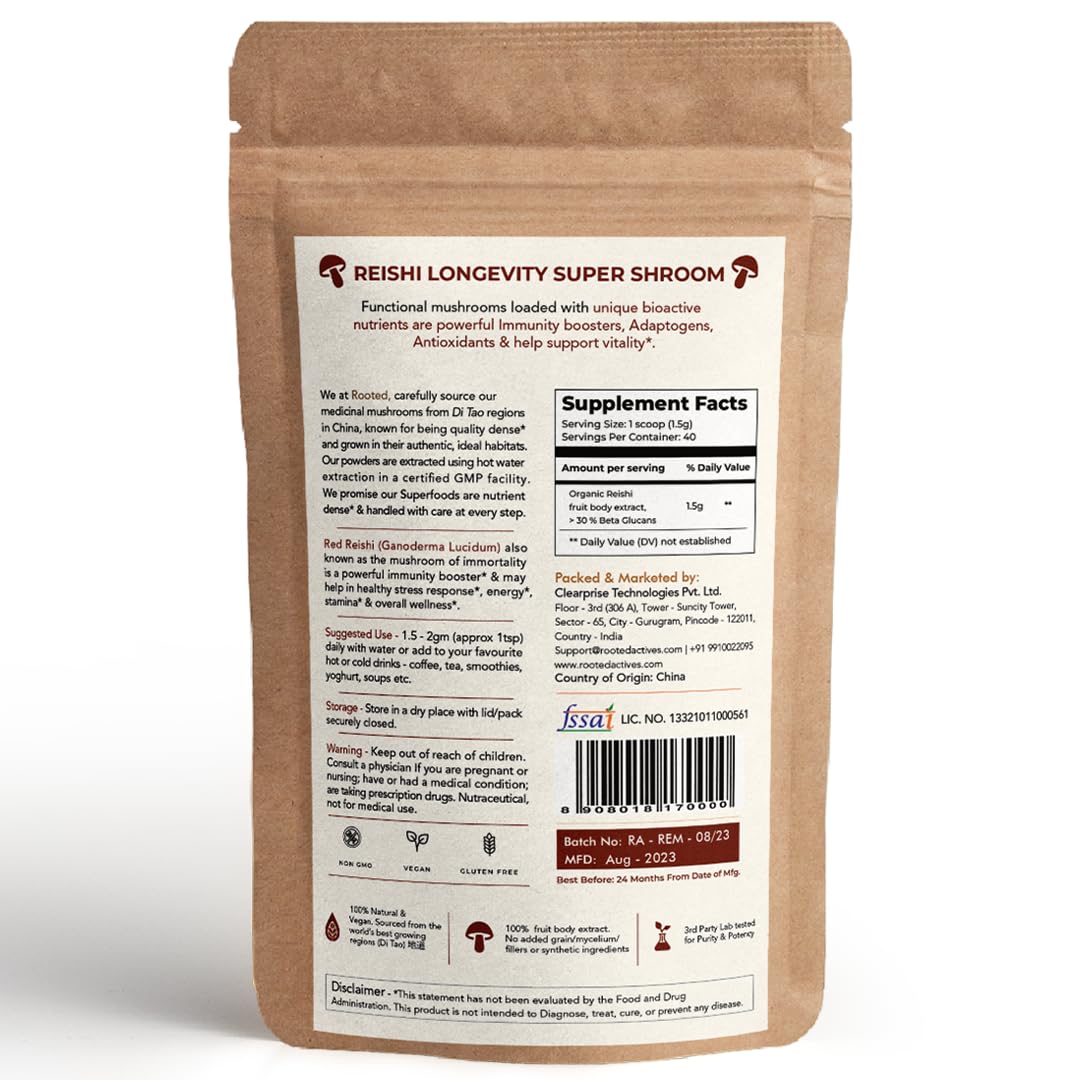 Concentrated extract powder from Pure fruiting bodies of Organic Red Reishi mushroom ( Ganoderma lucidum) Gano or Lingzhi). No mycelium or fillers used thus high in alpha beta glucans and quality of polysaccharides. Pure Reishi mushroom extract.