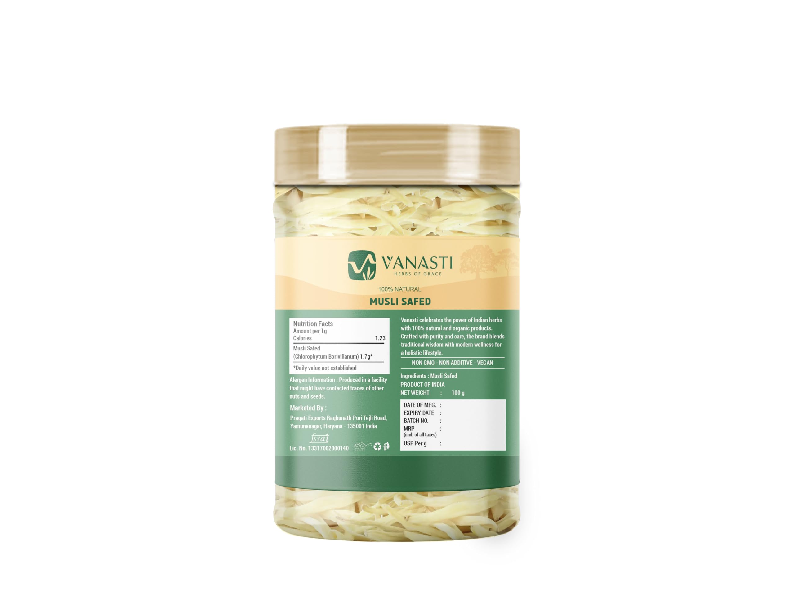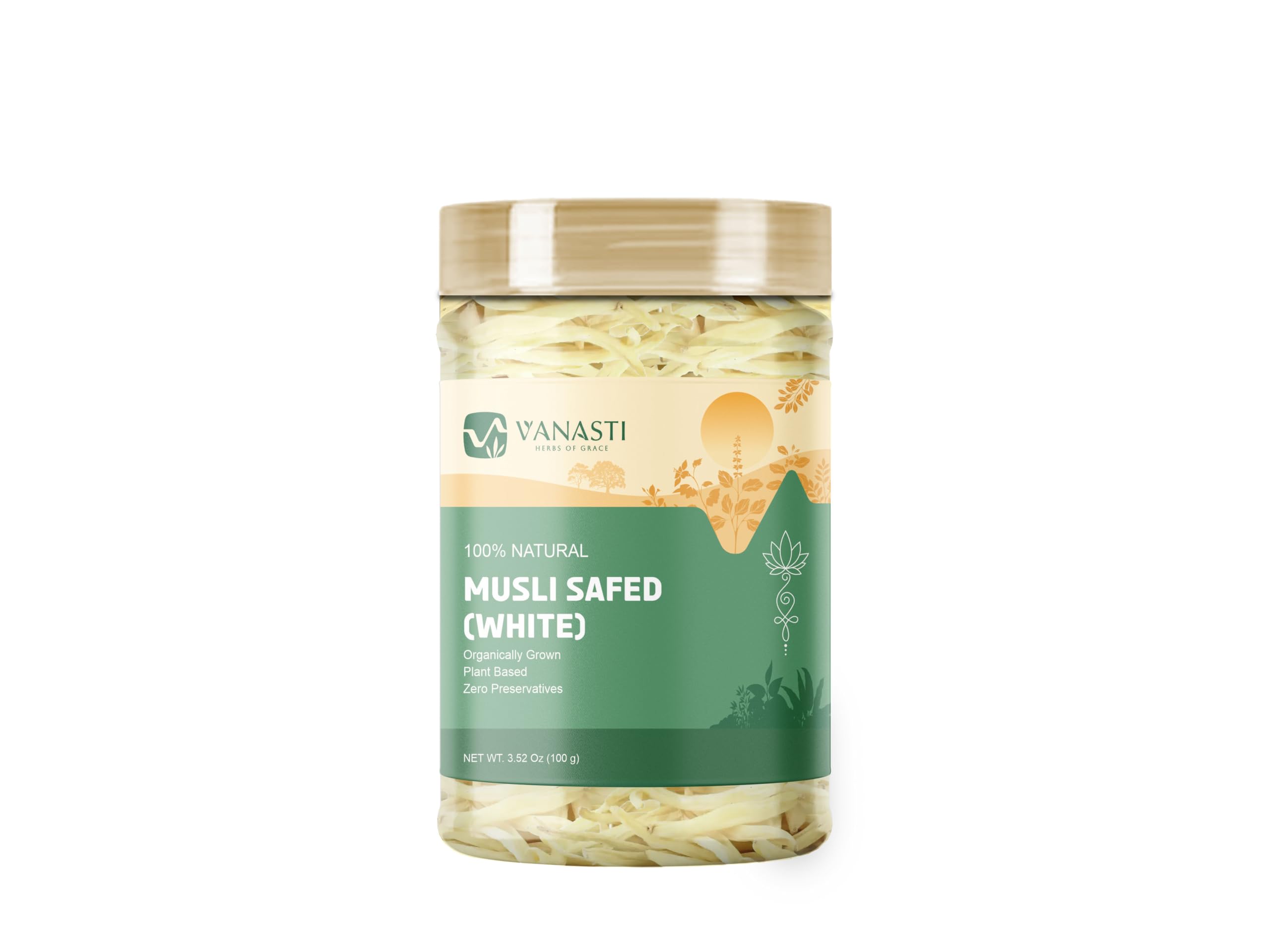 Musli Safed (also called White Musli, Chlorophytum borivilianum) is an herb known for its natural health benefits. It contains alkaloids, vitamins, and minerals like calcium, potassium, and magnesium, along with resins, phenols, and mucilage. Musli Safed is valued for helping to strengthen muscles and provide nourishment to the body.