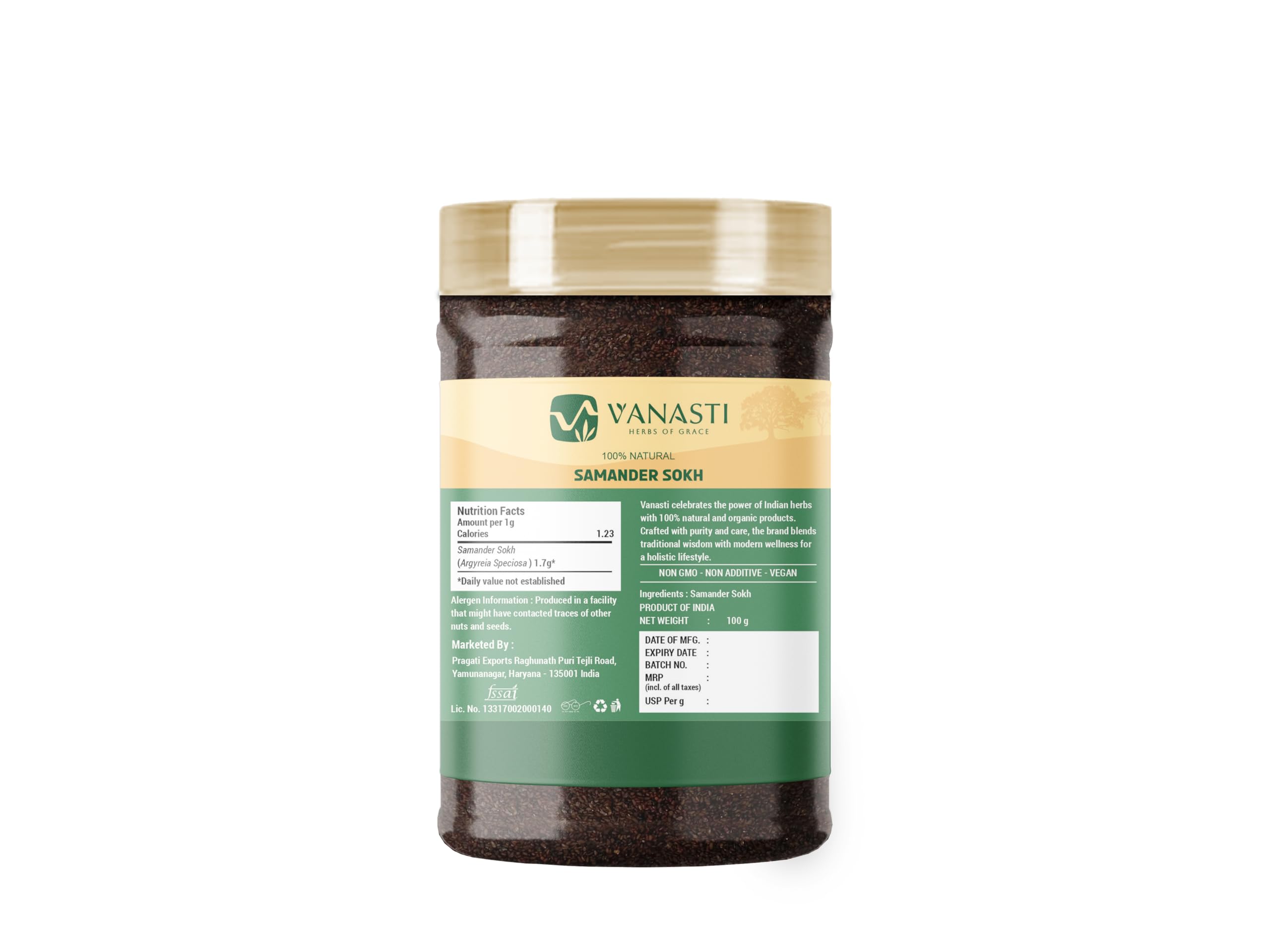 Samander Sokh is a traditional herbal preparation containing Argyreia speciosa, a plant widely used in Ayurvedic and folk medicine. Argyreia speciosa, also known as Elephant Creeper or Vidhara, is valued for its presence of various plant-based compounds. In traditional practices, this plant is included in herbal blends for its natural properties and is recognized for its use in supporting traditional wellness routines.