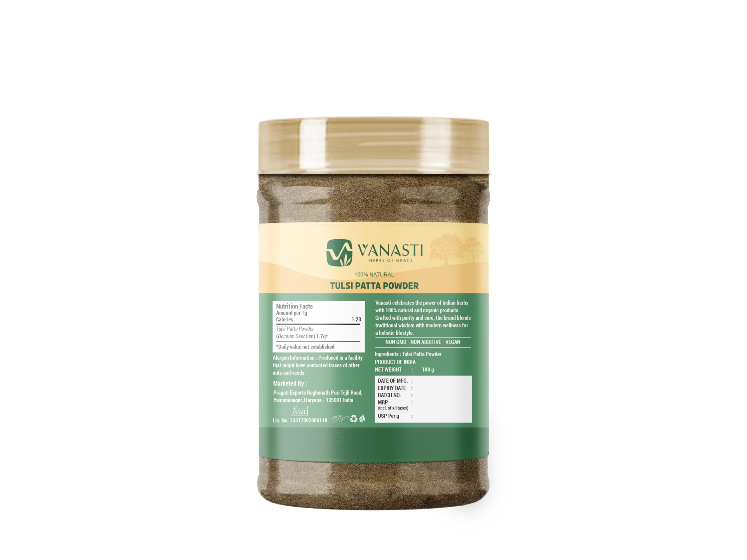 Tulsi Patta Powder is made from the dried leaves of Ocimum sanctum, also called holy basil. This fine green powder has a sharp, herbal aroma and a mildly bitter, peppery taste. It blends easily into teas, spice mixes, and herbal powders. Tulsi powder contains small amounts of vitamins A and C, along with calcium and iron. It is used mainly for its bold scent and earthy flavor. The powder stores well when kept in a dry, airtight container.