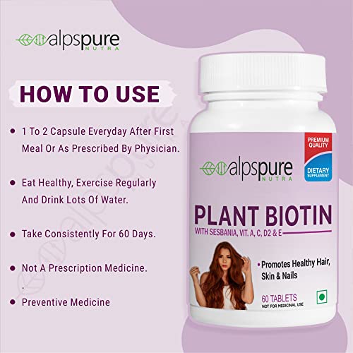 Promotes Thick Hair: Alpspure nutra's Plant biotin Tablets facilitates growth of thick and shiny hair. It is perfect for bringing dull and damaged hair back to life.