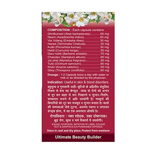 • It is a combination of ingredients: Ghritkumari Neem Via Vidang Harad Kutki Haldi Daru Haldi Chandan Jai phal Tulsi Khair Giloy and other prominent herbs.