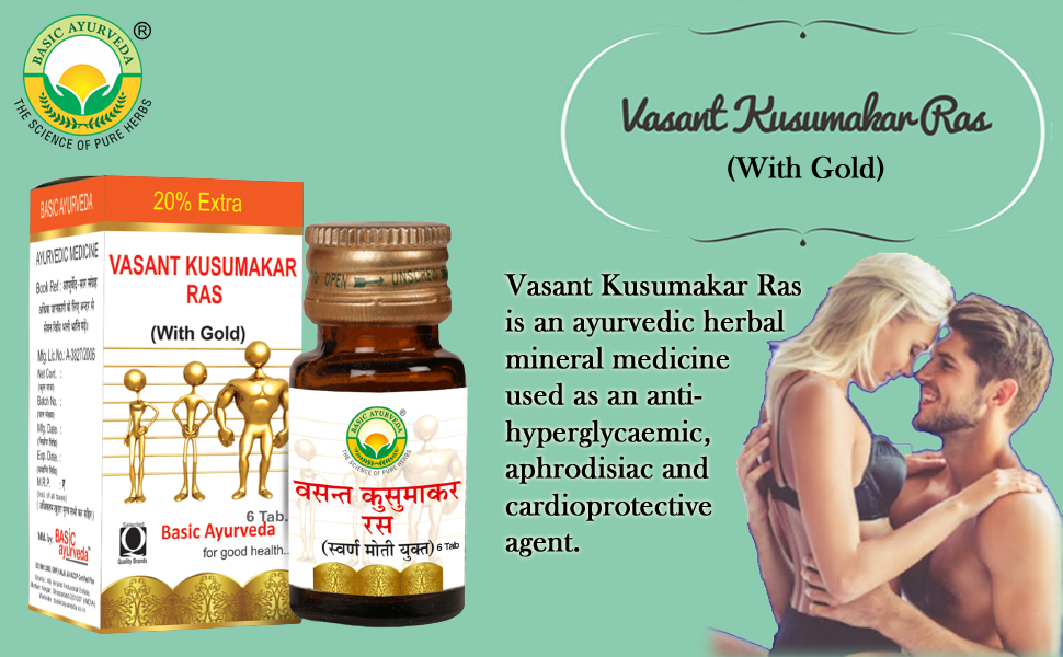 • Vasant Kusumakar Ras with gold is an ayurvedic herbal formulation in tablet form used as a hyperglycaemic and cardioprotective agent.