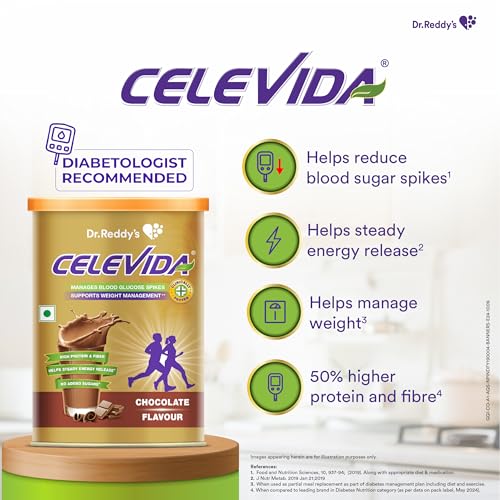 Dr. Reddy's Celevida is a food for special dietary use & a specialised nutrition drink which helps you in diabetes management. It has a balanced mix of protein (28g per 100g) dietary fiber (18g per 100g) slowly digested carbohydrates which support in managing the blood glucose and satiety. It also has 12 nutrients including Vitamin C Vitamin D Vitamin B12 & minerals like Zinc Iron Potassium Magnesium & more making it a perfect addition to support your immunity and healthy diet. Besides blood sugar control it helps in weight management & is good for your heart. Recommended to consume Celevida twice a day or as recommended by your healthcare provider. This is not to be consumed by pregnant nursing & lactating women or by infants children & adolescents except when medically advised. Also available in Kesar Elaichi flavor to tempt your taste buds! Do not consume if you're allergic to soy or milk protein. Disclaimer: Contains artificial sweetener and for calorie conscious this contains sucralose. Not recommended for children. Voted product of the year in nutrition supplement for diabetic category. Winner Nutritional Supplement for Diabetics Category. Survey of 2250 people by NielsenIQ across categories.